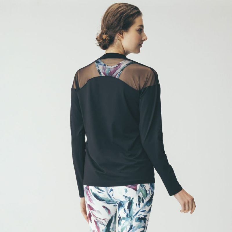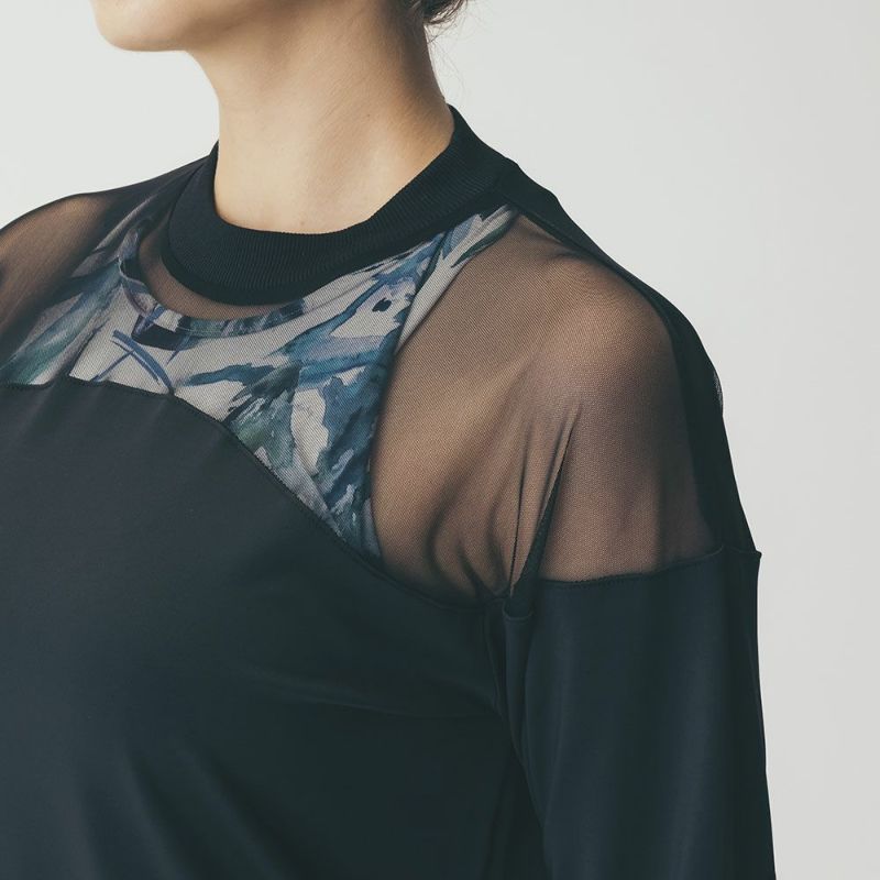 肩周りがチュール切替になったカットソー。透け感のある適度な肌見せで女性らしい印象になります。お尻までかかる丈感で、レッスン中はもちろん行き帰りにもおすすめです。薄手の素材でストレッチ性が高く着心地も快適です。デザインは人気ファッションブランドDOUBLE STANDARD CLOTHINGが監修しています。