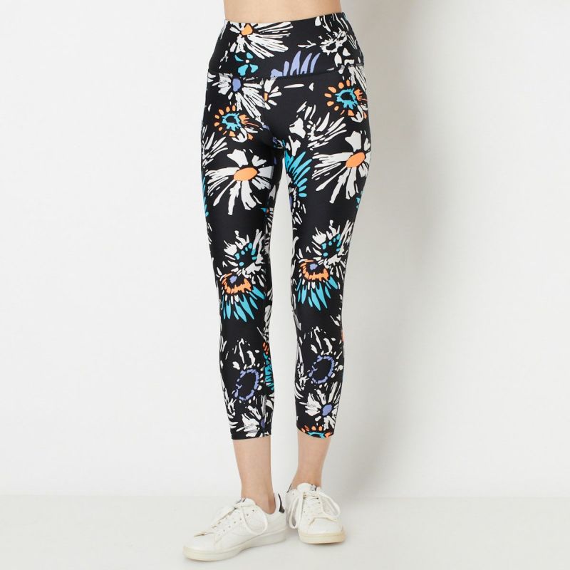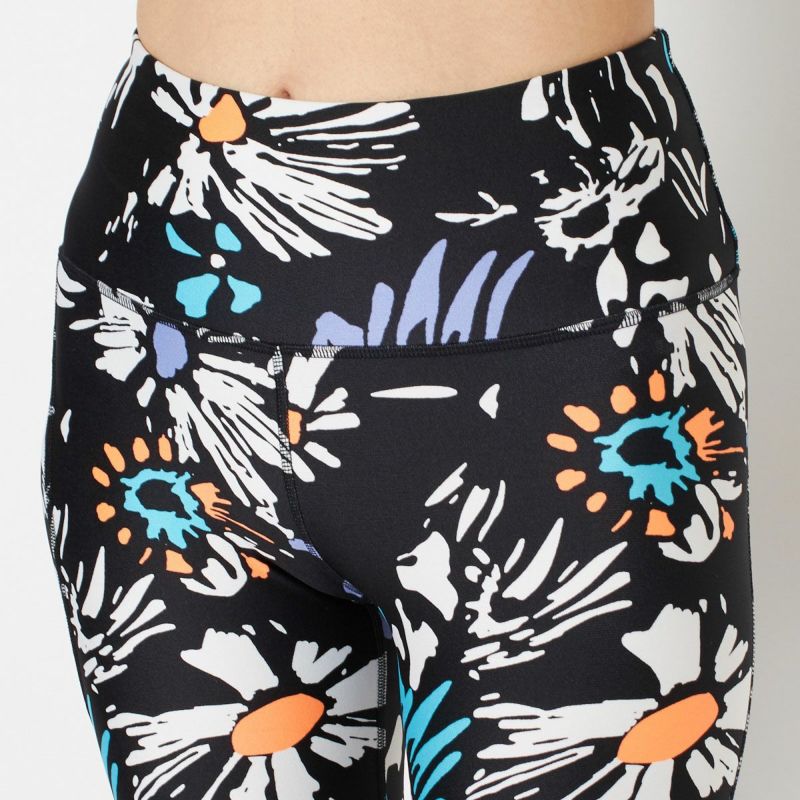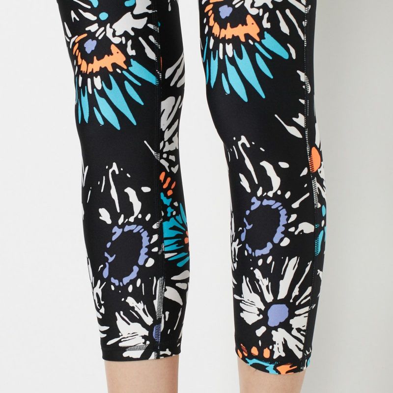 鮮やかなフラワープリントが目をひく7分丈レギンス。生地の程よい厚みと優れたストレッチ性で、足をキュッと引き締めてくれます。ウエスト部分は二重になっており、生地のストレッチ性を活かしながらお腹にフィットします。右もも部分にはウォーターボトルを収納可能なポケットがついています。