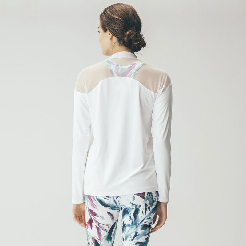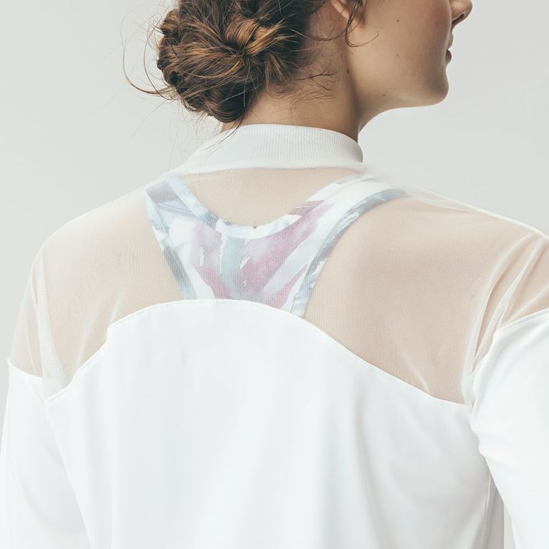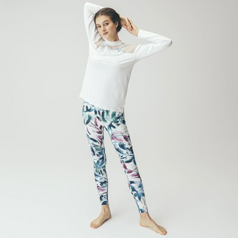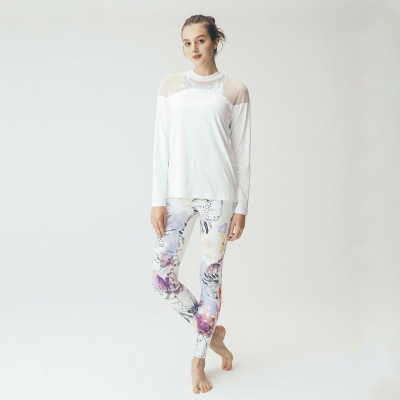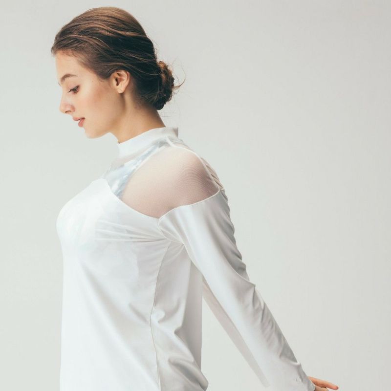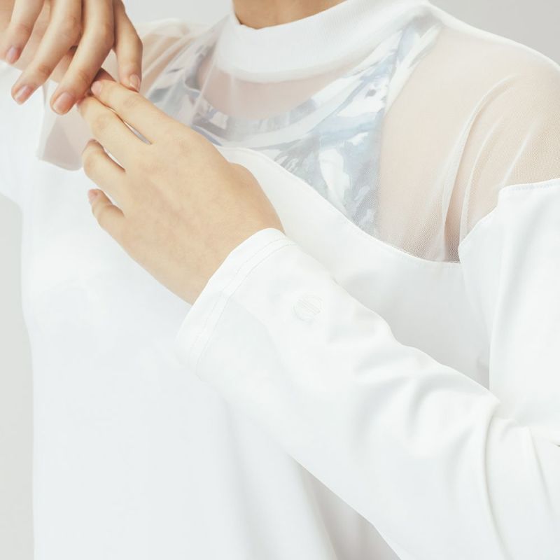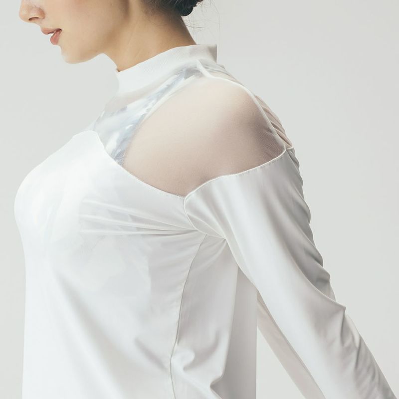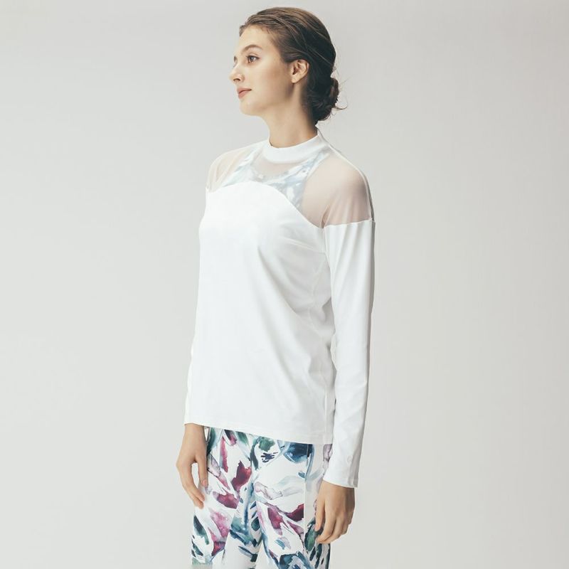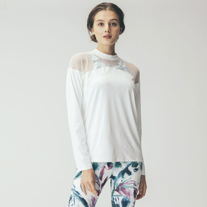 肩周りがチュール切替になったカットソー。透け感のある適度な肌見せで女性らしい印象になります。お尻までかかる丈感で、レッスン中はもちろん行き帰りにもおすすめです。薄手の素材でストレッチ性が高く着心地も快適です。デザインは人気ファッションブランドDOUBLE STANDARD CLOTHINGが監修しています。