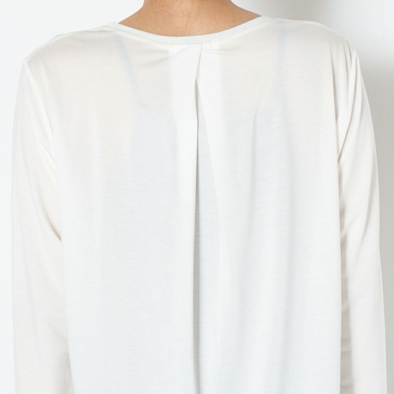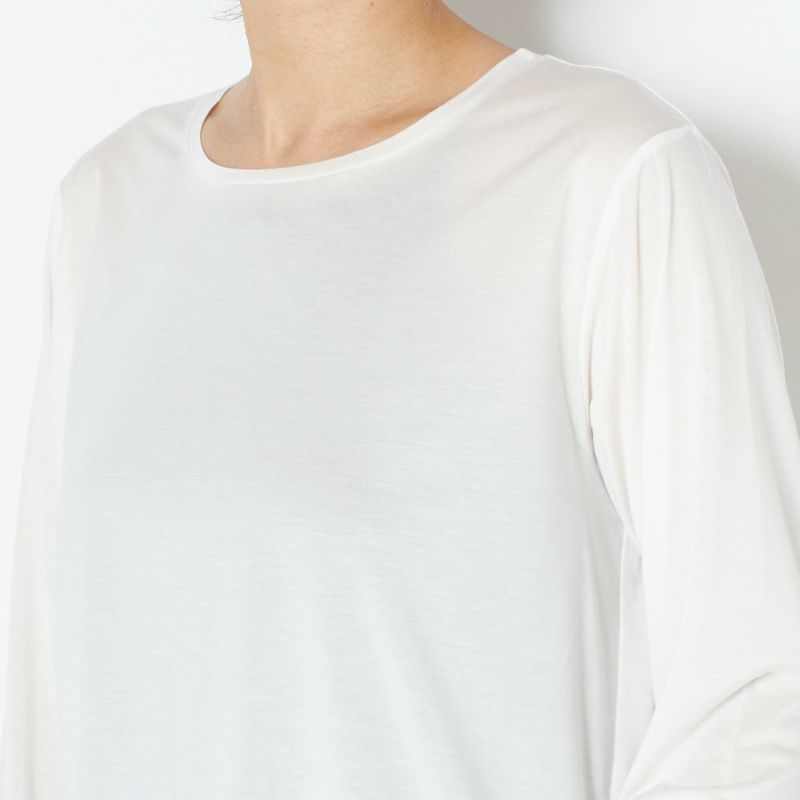 落ち感のある微光沢生地で仕立てたチュニック丈の長袖トップス。前後差のあるラウンドヘムとサイドスリットがフェミニンな一枚です。サラサラとした生地感で肌離れがよく、ストレッチ性にも優れています。