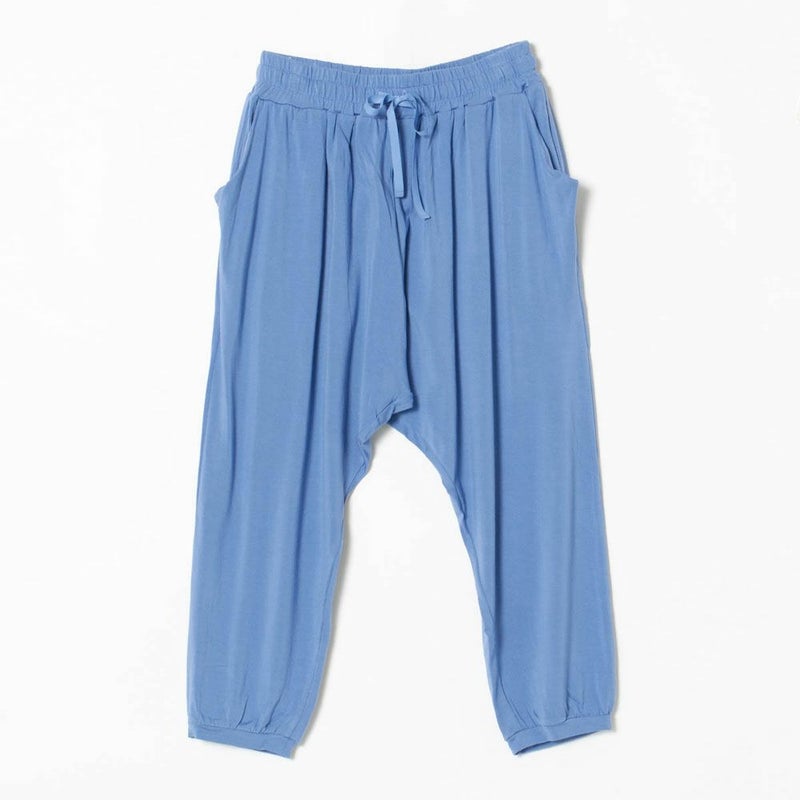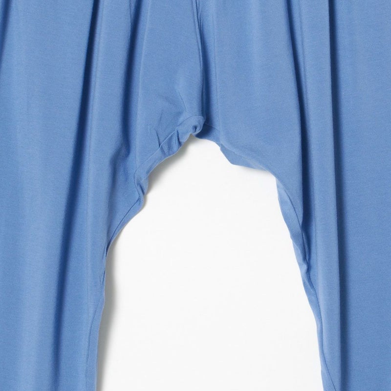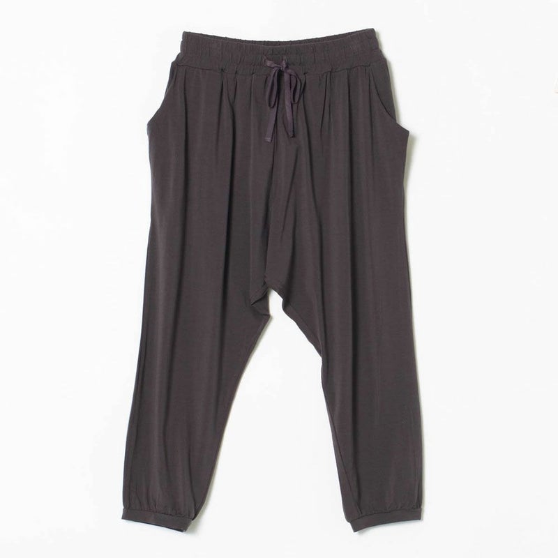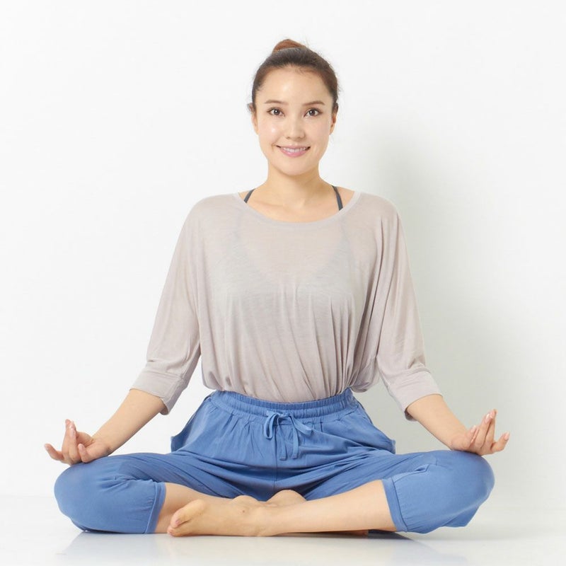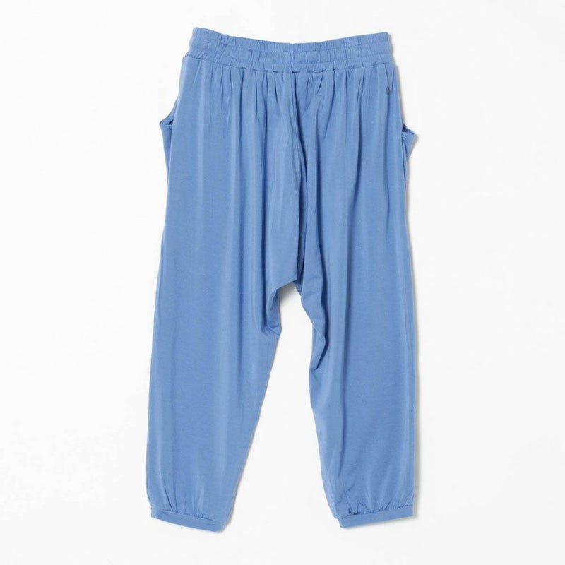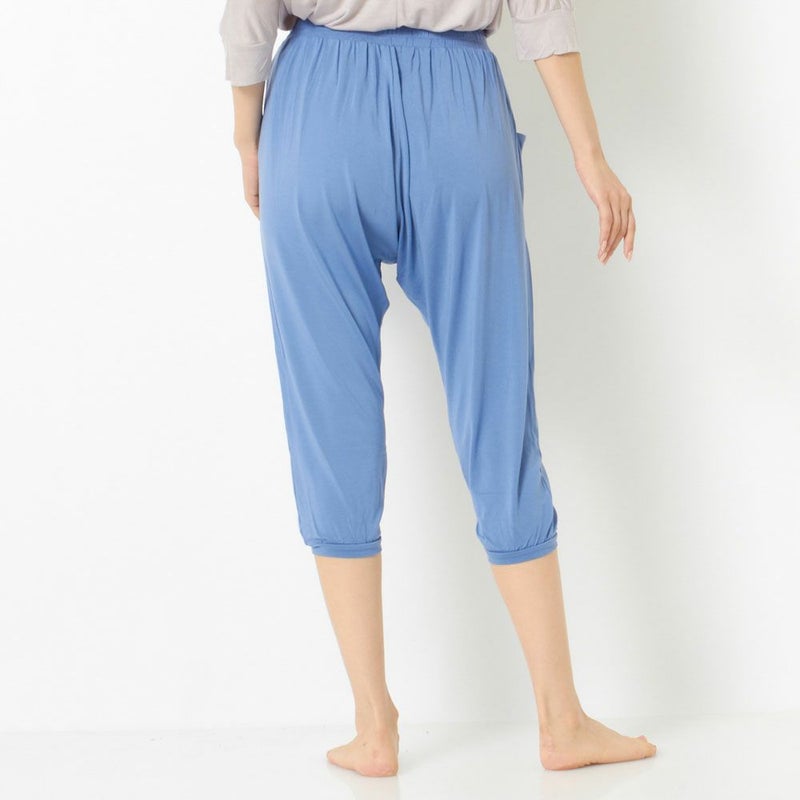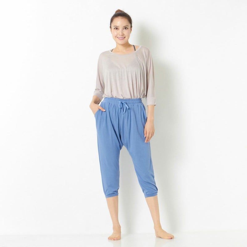 緩いシルエットで様々なポーズをとっても締め付け感を感じないパンツ。 半端丈デザインなので通気性が良く、裾にはゴムが入っているのでずれにくいのも特徴です。 ウエストにはゴムが入っているので安定感も良く、伸縮性の高い生地ははき心地と実用性を兼ね備えています。