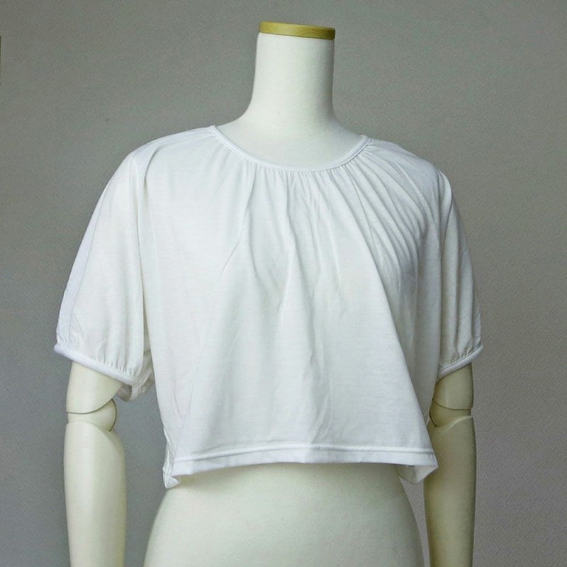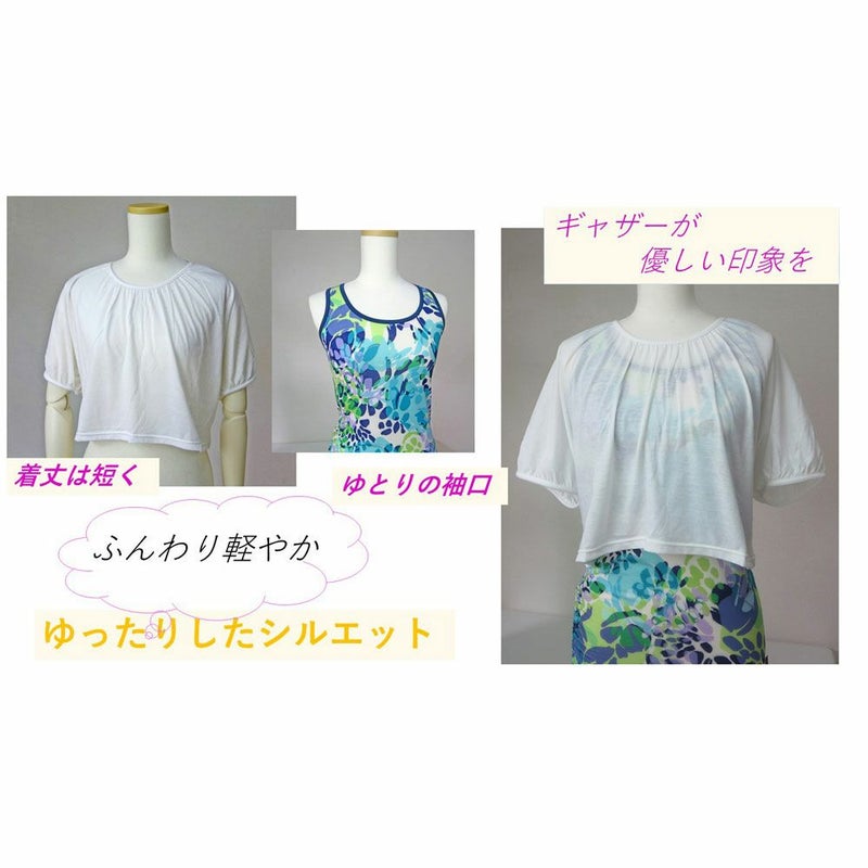襟ぐりのギャザーが、優しい印象の首回りを演出しています。