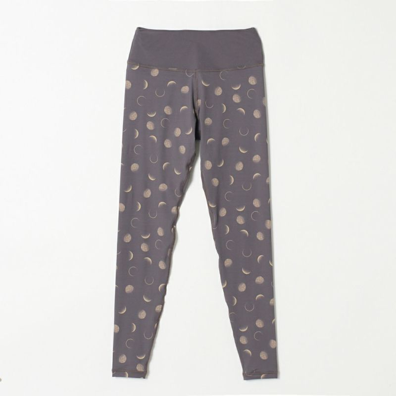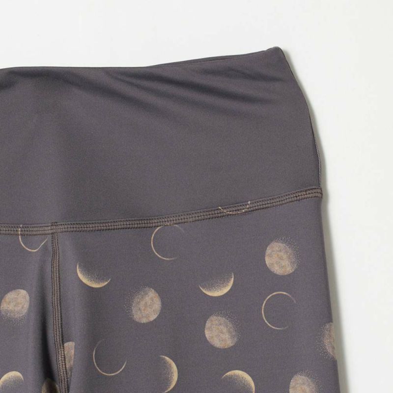 月の満ち欠けをイメージしたデザインが印象的なレギンス。抜群のストレッチ性とフィット性で、ヨガの大きな動きにも対応します。ウエスト部分は切り替えを広めに取っているので、締め付けを軽減してくれます。やや厚手の生地感で透けにくく、ショートパンツとのレイヤードやロング丈チュニックとの合わせなど、コーディネートの幅が広がります。