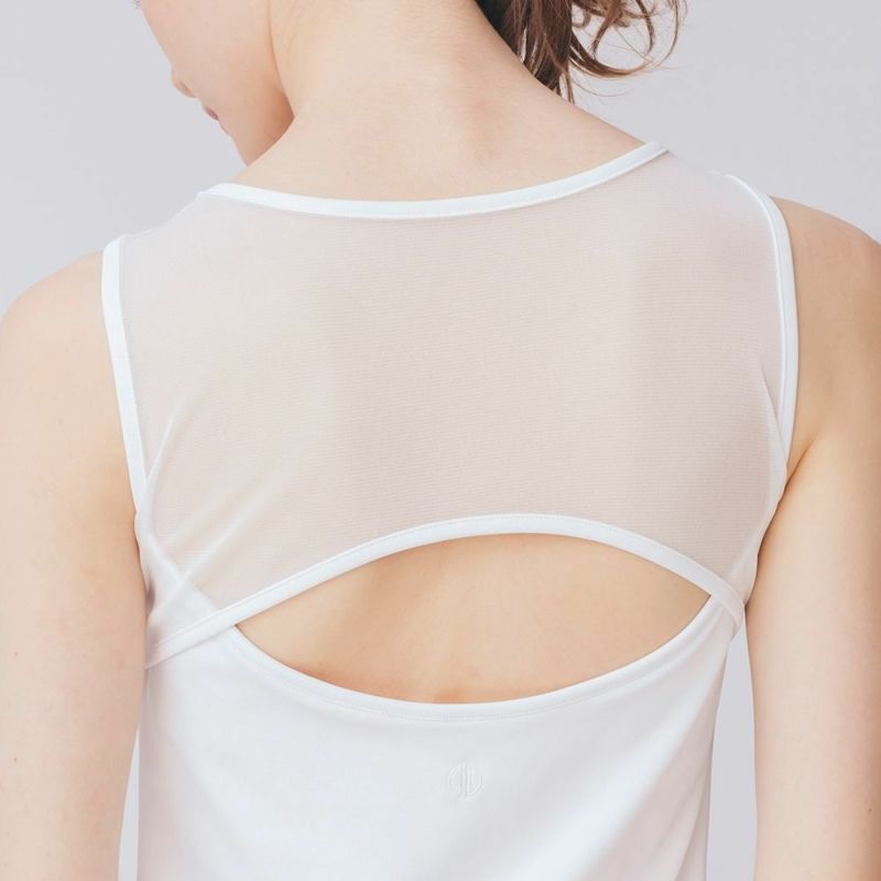 肩周りをチュールで切り替えたタンクトップ。シアー素材の透け感と胸元のシャーリングが女性らしい印象に。露出を控えつつ適度な肌見せができます。吸水速乾素材で涼しく快適な着心地です。デザインはDOUBLE STANDARD CLOTHINGが監修しています。