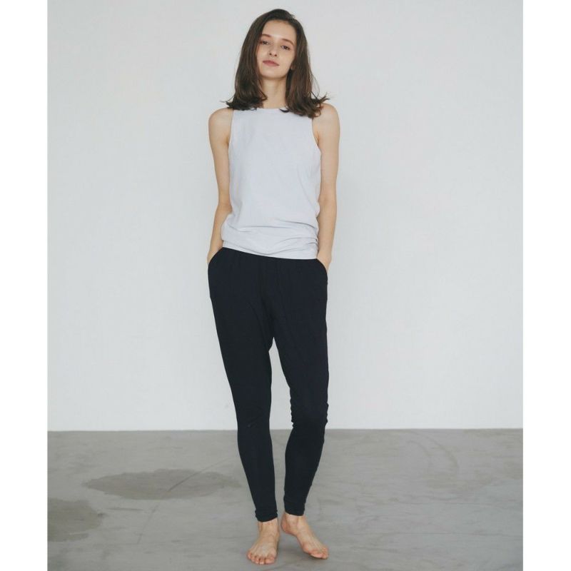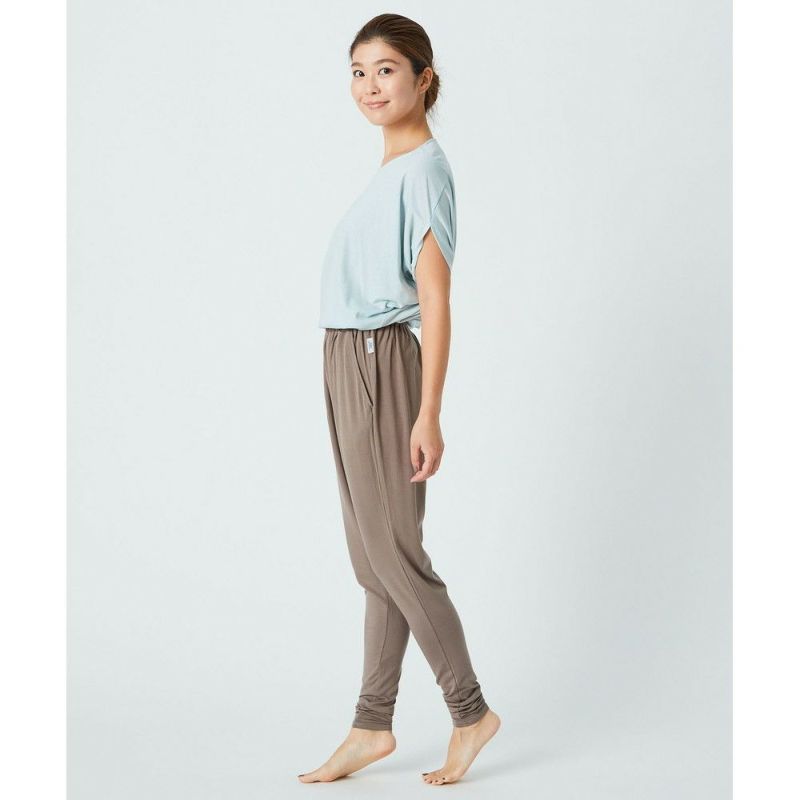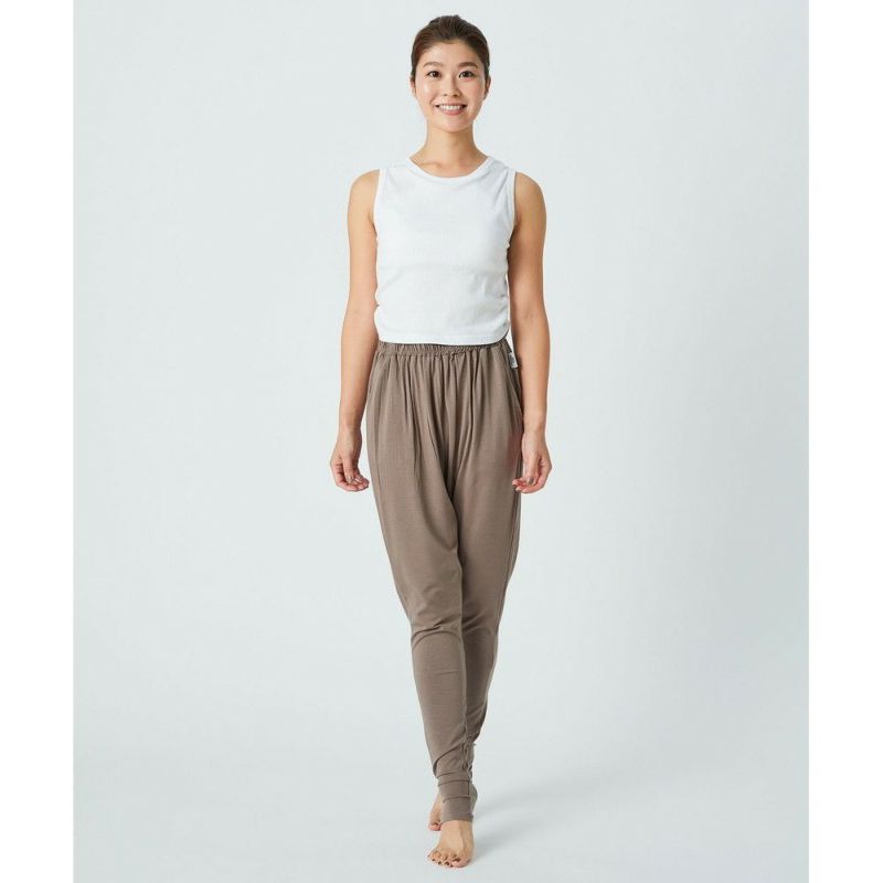 ひざ下からシェイプされているギャザーパンツです。丈が長めなので足首でたるませても、裾をかかとにかける着こなしもOK。とても柔らかい生地で肌触りが良く、リラックスウェアとしてもおすすめです。