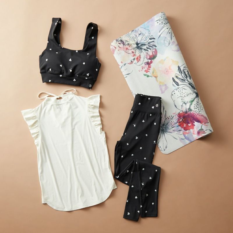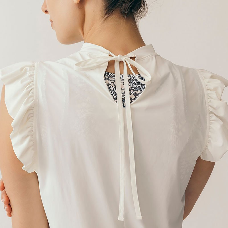 肩のフリルがフェミニンなデザイントップス。後ろはリボンで結べるハイネック仕様。薄くて軽いなめらかな速乾素材を使用し、汗をかいても快適に過ごせます。ヨガだけでなくレッスンの行き帰りにも着用でき、コンパクトに持ち運べるためトラベルウェア、ビーチシーンにもおすすめです。デザインはDOUBLE STANDARD CLOTHINGが監修しています。