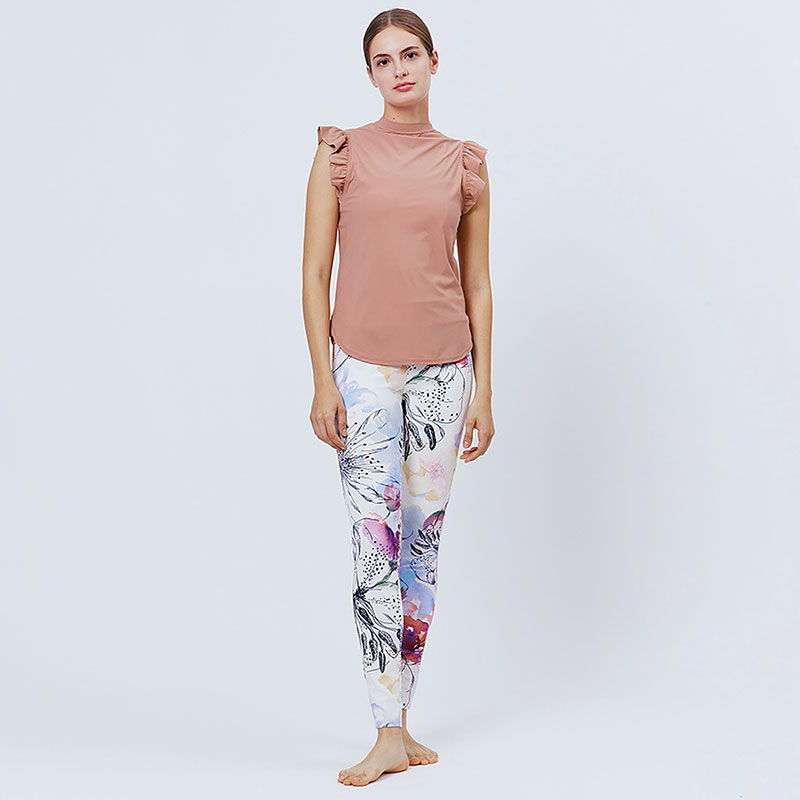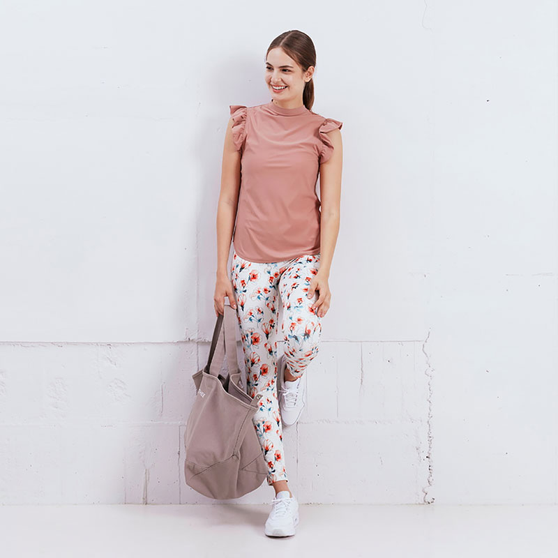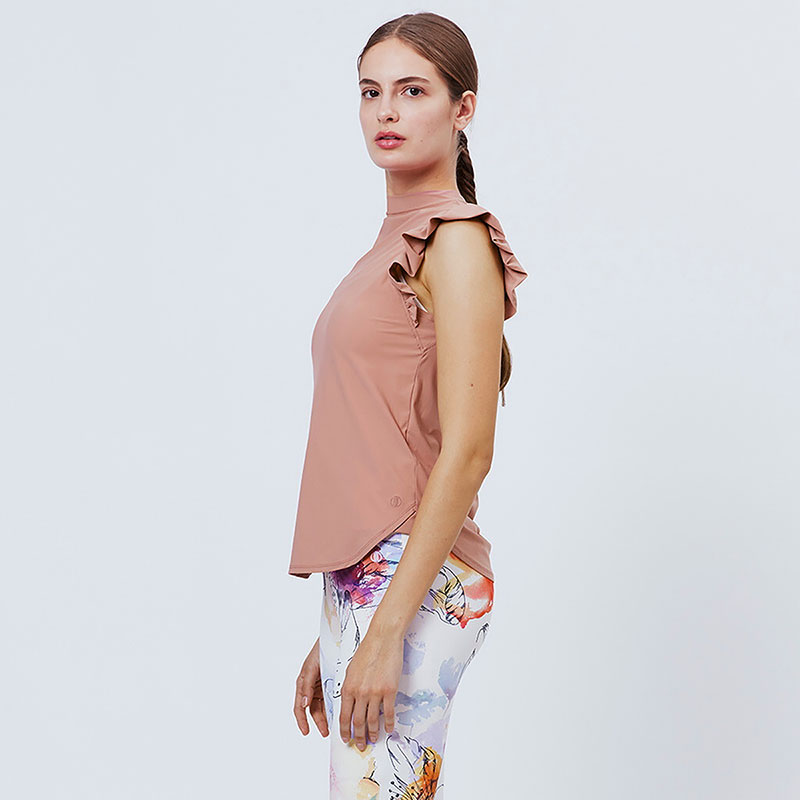 袖のフリルがフェミニンなデザイントップス。後ろはリボンで結べるハイネック仕様。薄くて軽いなめらかな速乾素材を使用し、汗をかいても快適に過ごせます。コンパクトに持ち運べるためトラベルウェア、ビーチシーンにもおすすめです。