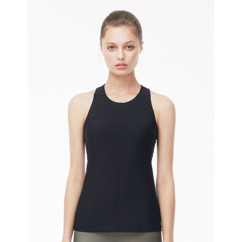 丁度いいモード感が楽しめる縦長ラインのタンクトップ。ハイネックなので前屈も反りも安心してポージングできます。クロス&ダブルストラップのバックラインは肩甲骨を支えつつ、綺麗に映える背中演出。吸水性、速乾性も優秀。ファッション性と機能性をクリアしたクールビューティーなトップスです。綺麗めデザインだからこそ、上品ブラックをチョイス。