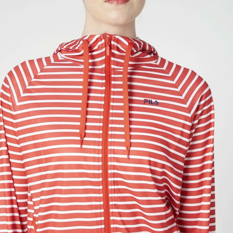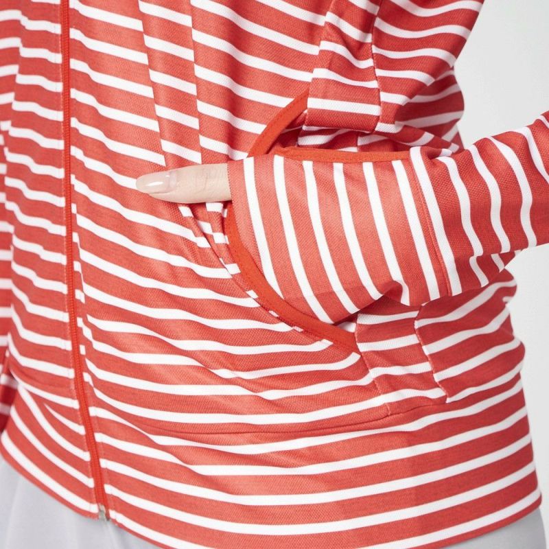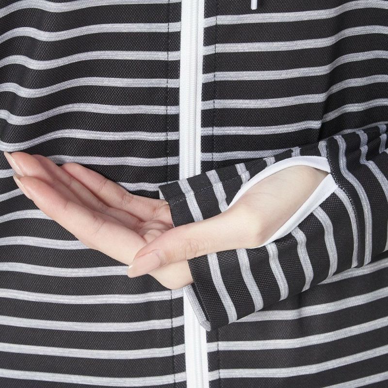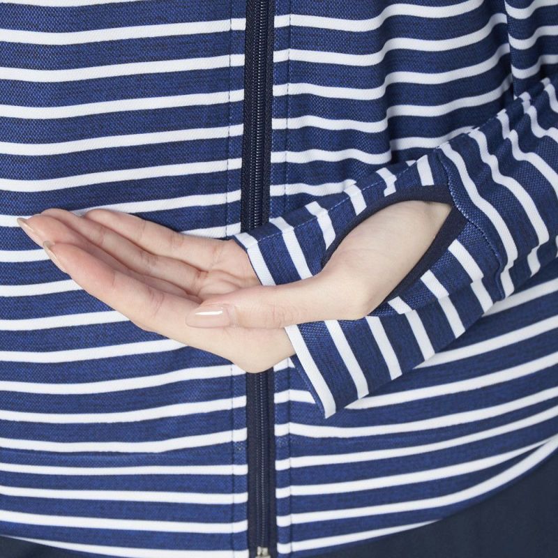 パーカー襟ぐりはスピンドルで調節可能。指穴仕様。ポケットは、カラーパイピングがアクセントになっています。
