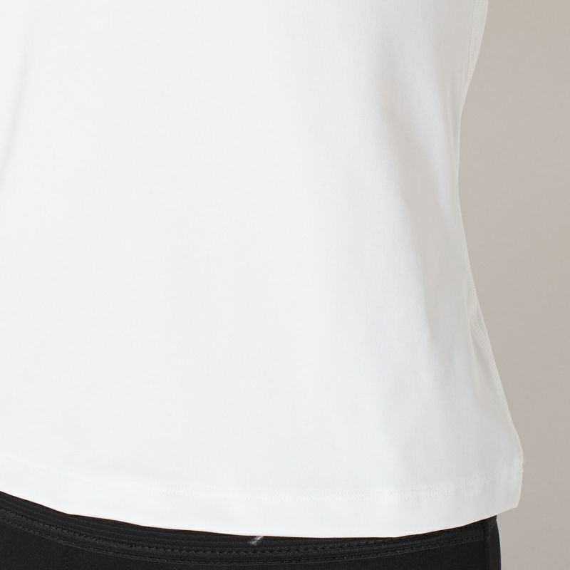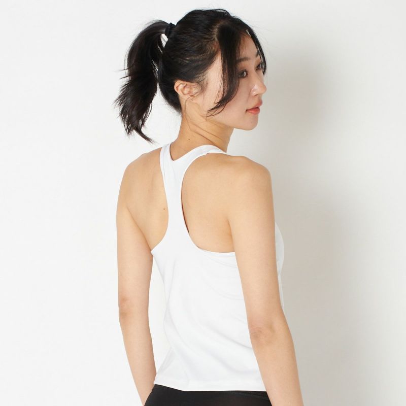 サラサラとした肌触りのストレッチポリエステル生地で仕立てた、ブラパッド一体型のタンクトップ。ワンポイントのみのシンプルなデザインで、着回し力の高いアイテムです。肩甲骨周りが広めに開いたデザインで、腕を動かしやすく、きれいなバックスタイルを演出。ウエスト周りをカバーする丈感で、あまりお腹を見せたくない方にもおすすめ。