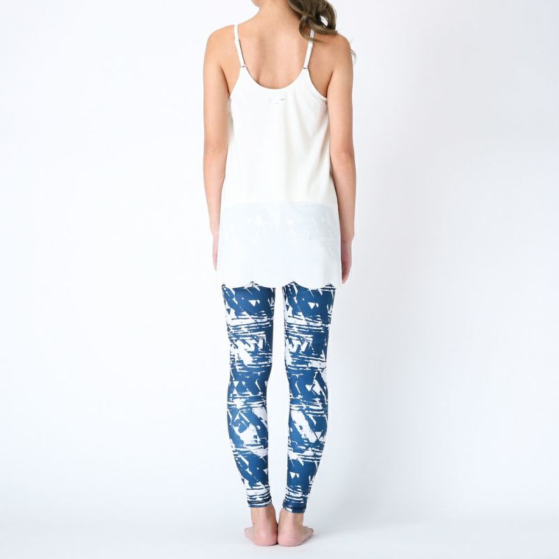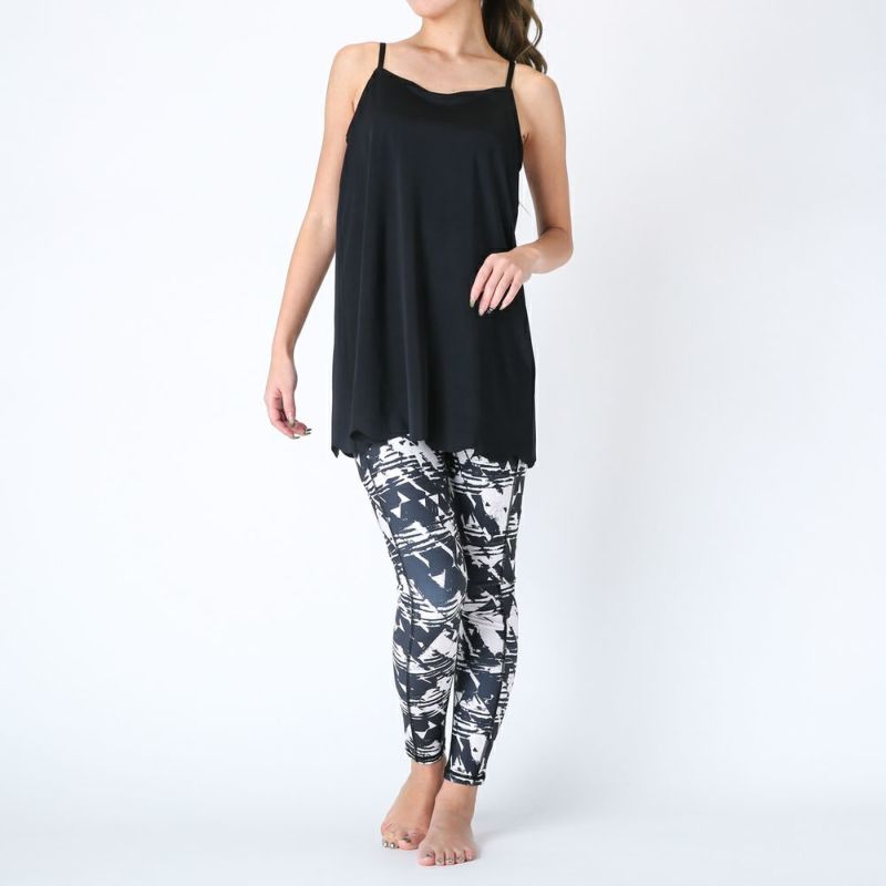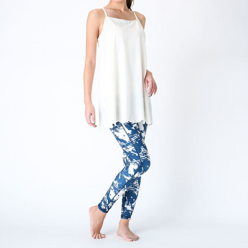 裾のスカラップデザインがフェミニンなロングキャミと総柄プリントデザインのヨガパンツのセット