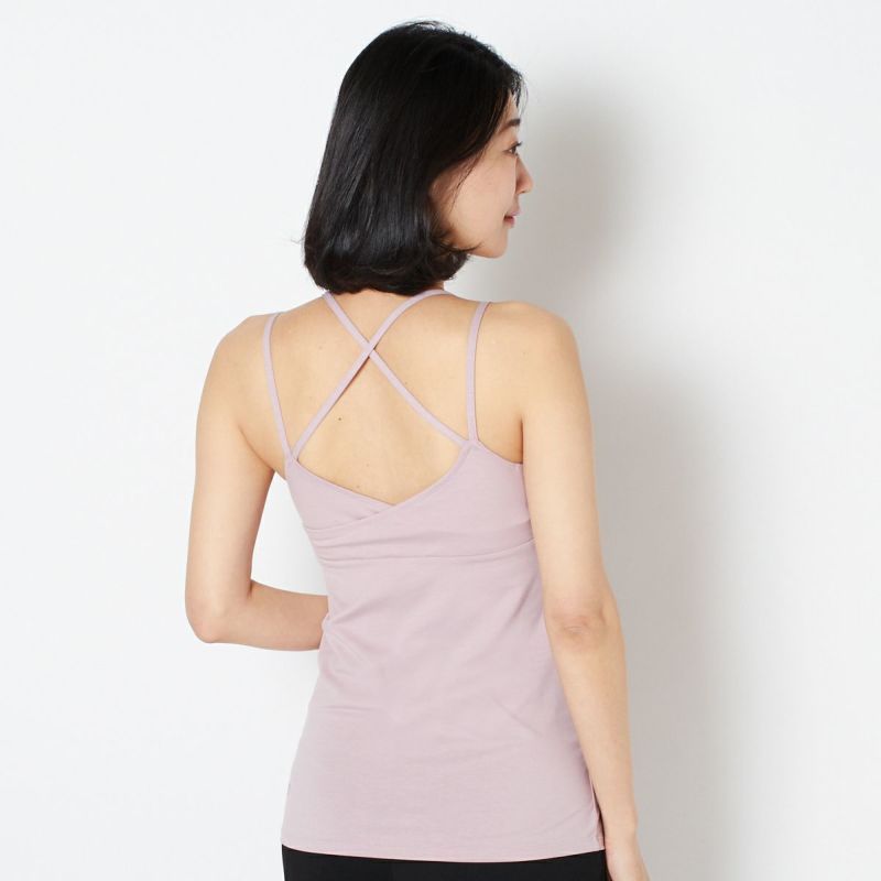 女性らしいシルエットが魅力のキャミソールトップス。裾はややフレアになっており女性らしいシルエットデザインです。背中を美しく見せるクロスストラップは着用時の安定感をプラスします。