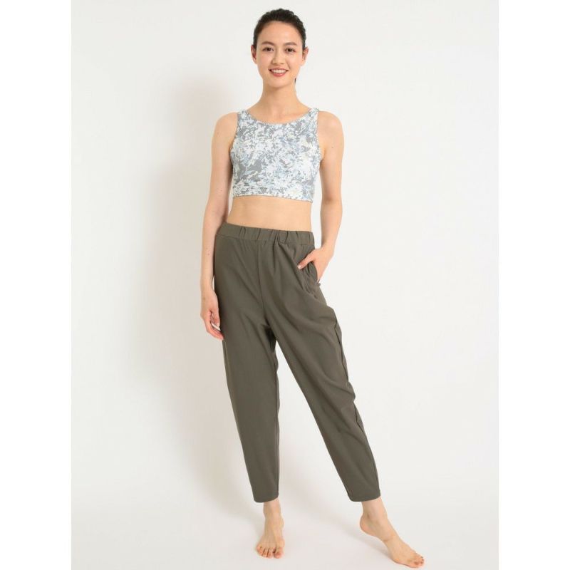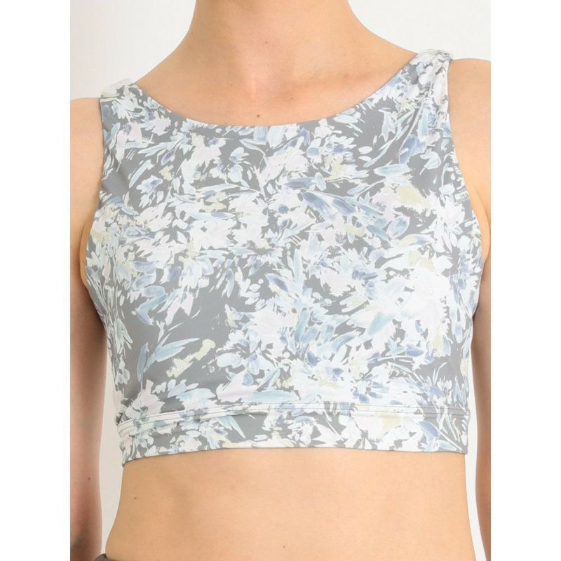 前は鎖骨周りをきれいに魅せるネックライン、後ろは細い紐がクロスされたデザインで華奢な印象のカップ付きブラトップ。オリジナルの手書き風フラワープリントでコーディネートに華やかさをプラスします。