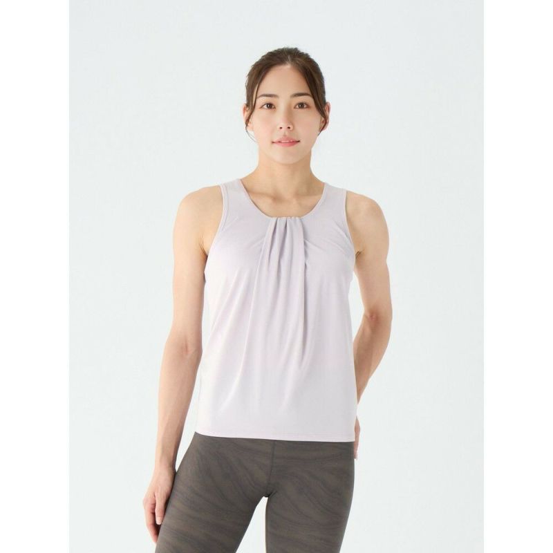 リピーター様多数のブラ付タンクトップ「コルデラタンク」をバックデザインの露出を抑え、より着やすいデザインにし柔らかく軽い素材にアップデート! スポーティになりがちなタンクトップも、美しく大きなドレープで女性らしい印象に。吸水速乾素材でホットヨガにおすすめです。