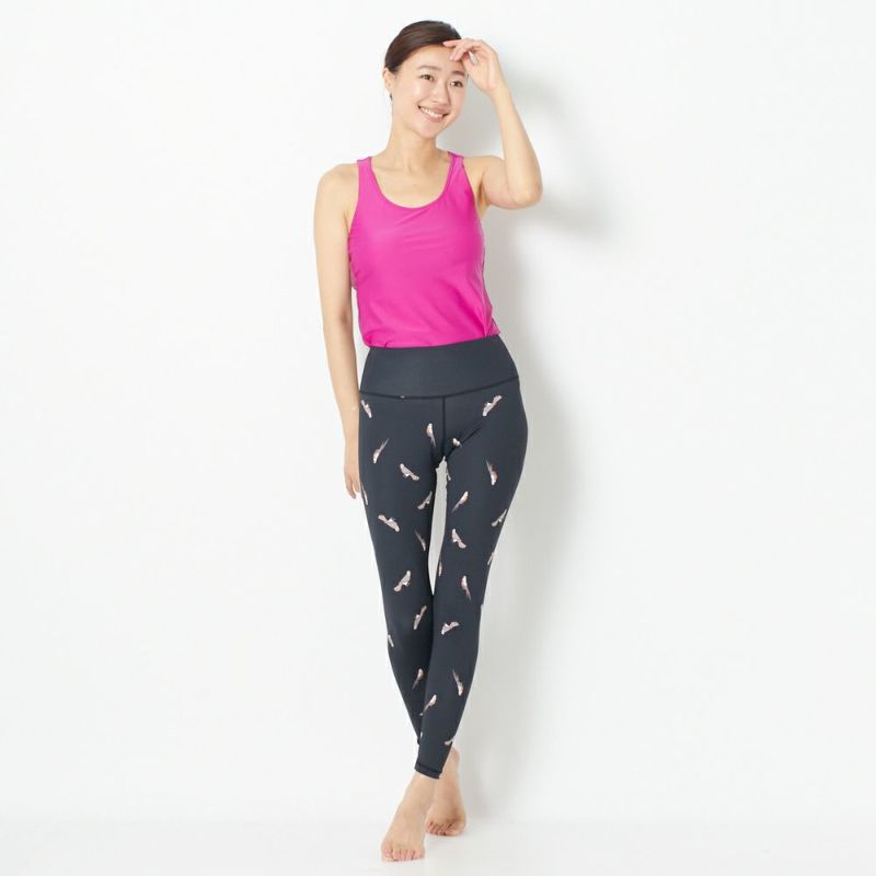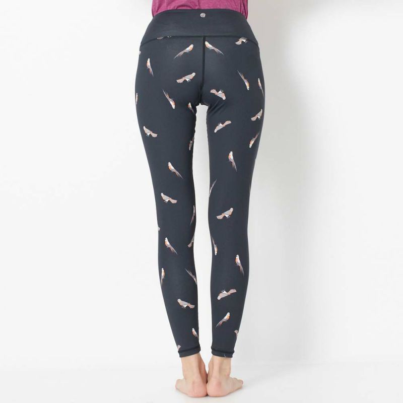 バードプリントが全面にデザインされた個性派レギンス。ベースはブラックなので、派手になりすぎずにコーディネートに取り入れられます。ストレッチ性に優れ、フィット感のある履き心地です。ヨガの動きに合わせて作られたレギンスなので、快適なヨガ運動をサポートしてくれます。