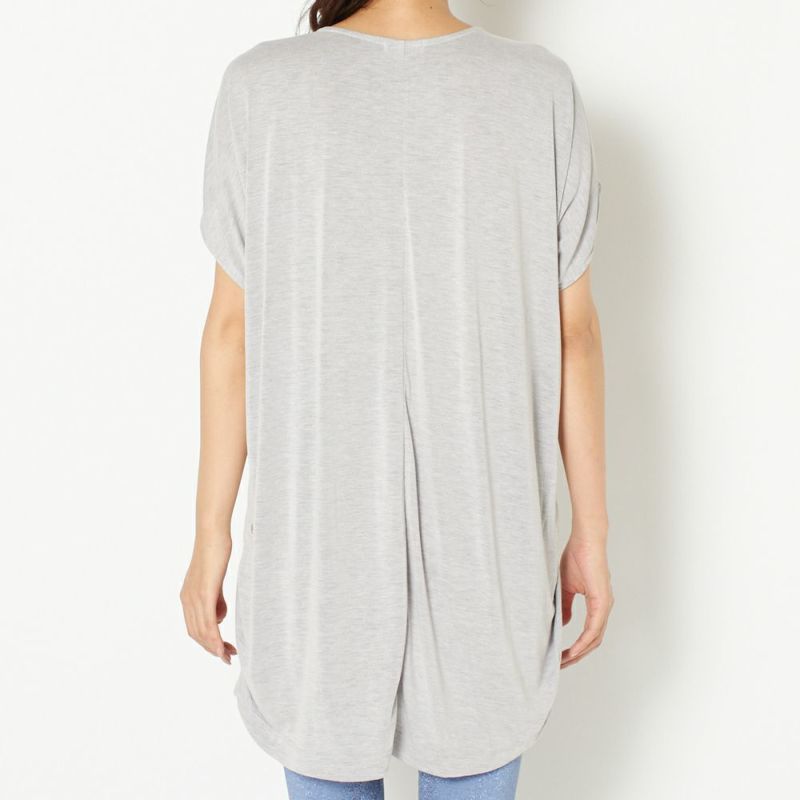 微光沢感のある柔らかなレーヨン生地で仕立てたトップス。たっぷりと生地を使用した、裾にかけての落ち感が上品なアイテムです。ゆるやかなVネックがきれいなデコルテ見せを叶えてくれます。二の腕、お腹、太ももと気になるパーツを目くらましてくれる絶妙な丈感も嬉しいポイント。