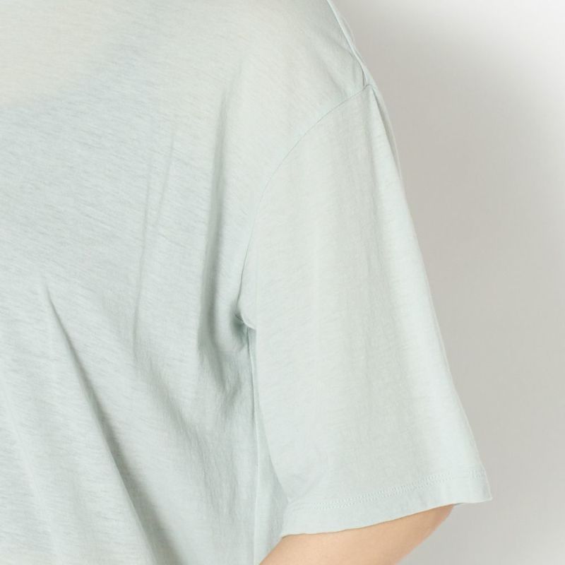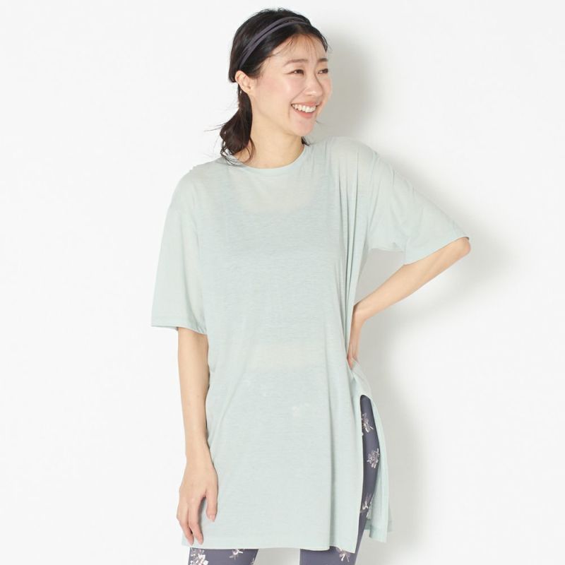 ゆとりのあるシルエットで動きやすく、ストレッチが効いているので動きの邪魔にもならないトップス。生地はとてもなめらかで肌触りも良く透け感があるので、重ね着を楽しむことができます。フロントにはスリットがはいっており、裾を結ぶことで違うスタイルにもできます。長めの丈感なので、ヒップラインのカバーもしてくれます。