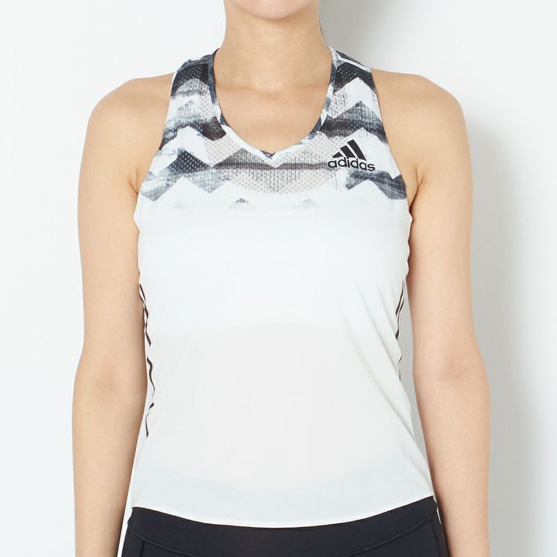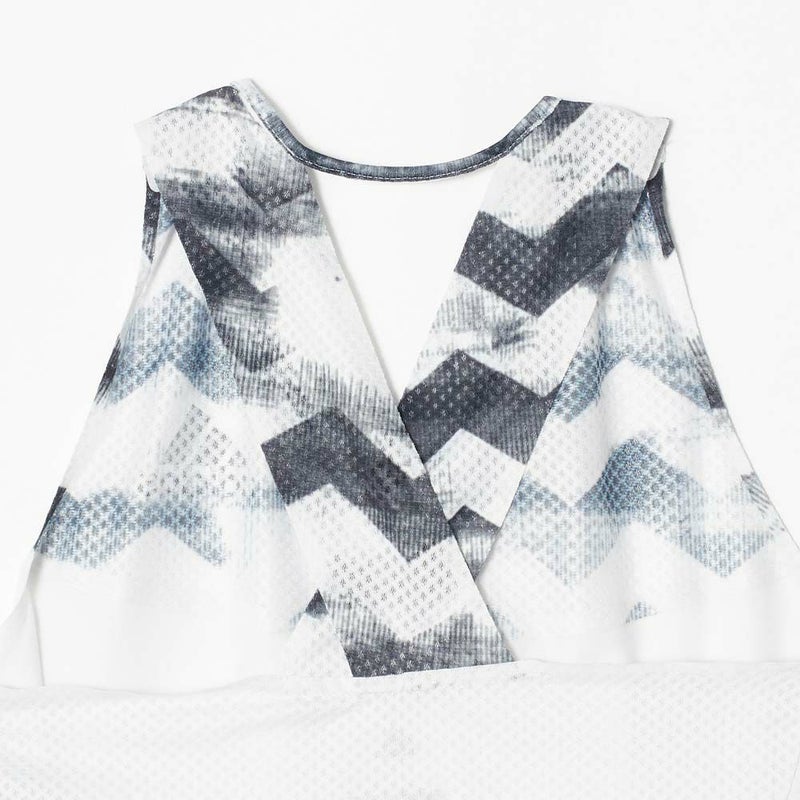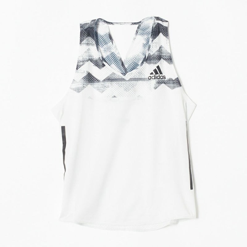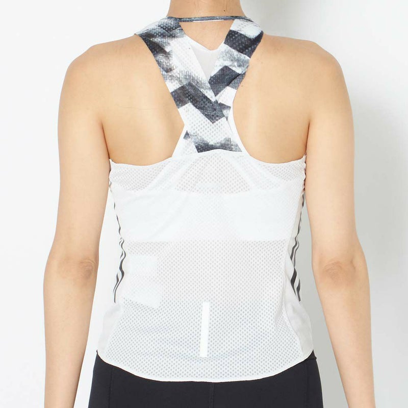 胸から上部分の柄の切り替え、3本ライン、背中のメッシュ切り替えなど、デザイン性に富んだトップス。とても通気性が良いので、長時間のランニングでも快適です。生地の肌当たりも優しいです。