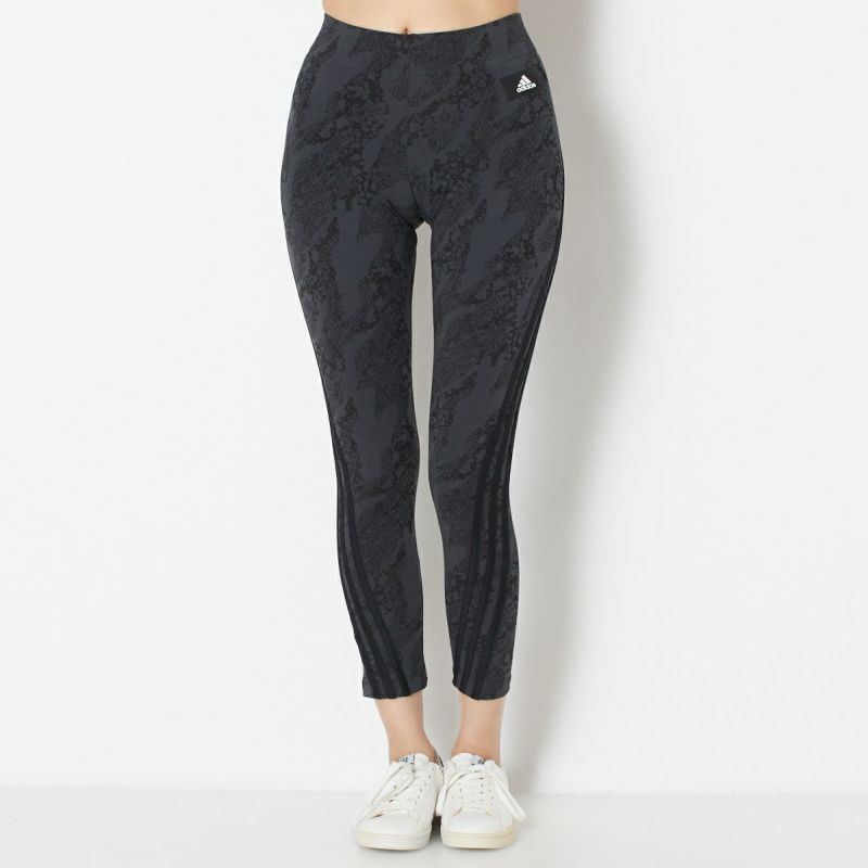 コットン×ポリエステルの混紡素材を採用した、しっかりとした厚手の生地感とストレッチ性で引き締め効果の高いタイツ。背面から前裾にかけてスリーストライプの立体的なラインをあしらった、視線を誘う一枚です。総柄デザインながら同系色なので派手になりすぎす、あらゆるデザインのトップスと相性良くまとまります。