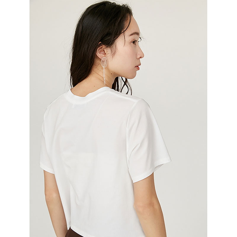 クロップド丈でハイウエストのボトムとも相性が良く、どんなボトムスと合わせてもバランスのとりやすいトップスです。
