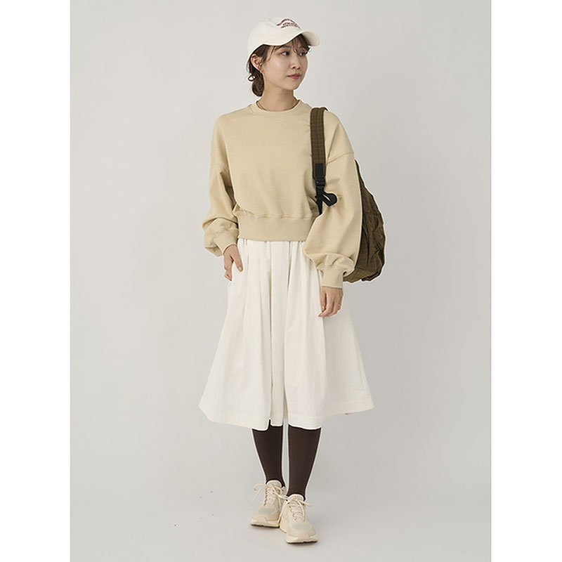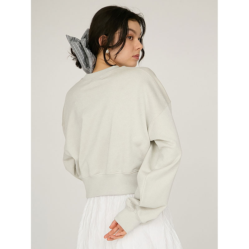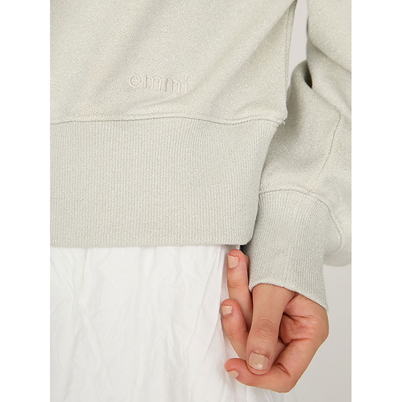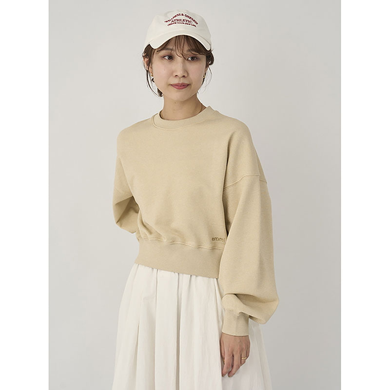 小さめに設定している裾と袖口のリブを活用して、ブラウジングして着こなすとぐっとこなれ感が出ます。裾付近には小さくemmiロゴを配置。