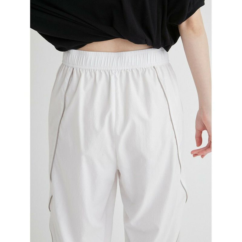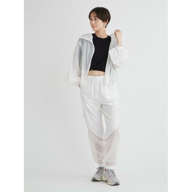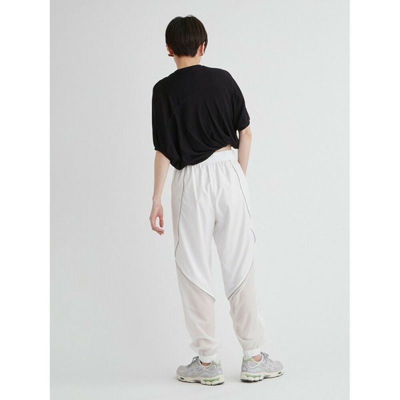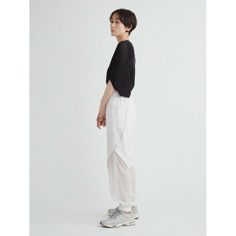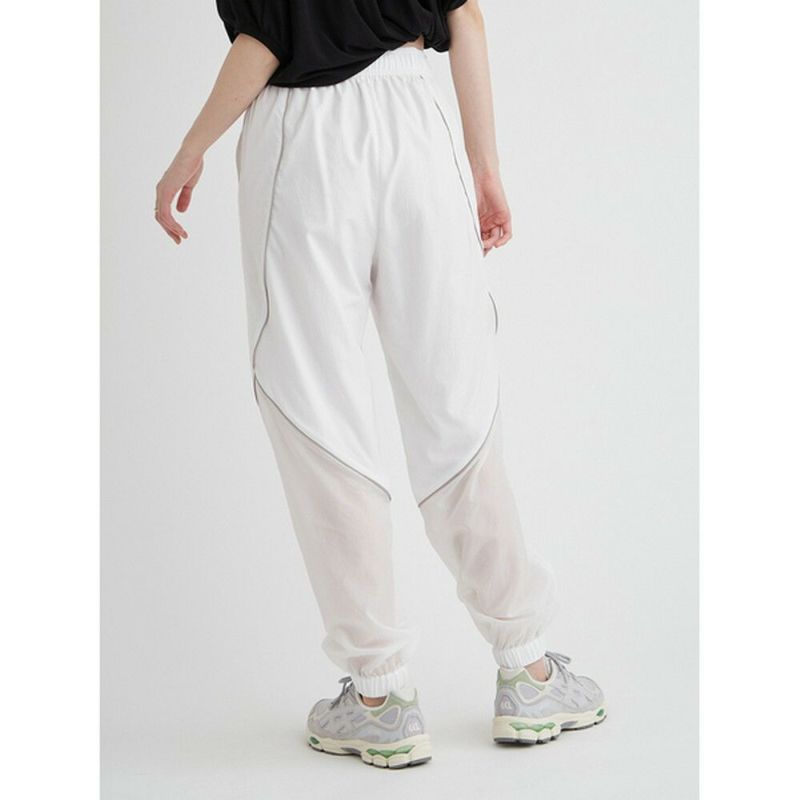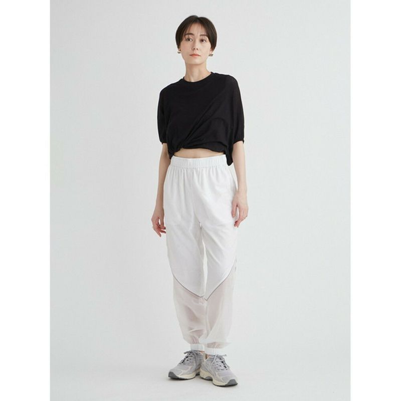 空気のように軽いウエストゴムのアクティブパンツ。有機的な曲線をパイピングで表現し、膝から下がシアーで透け感のある仕様になっています。