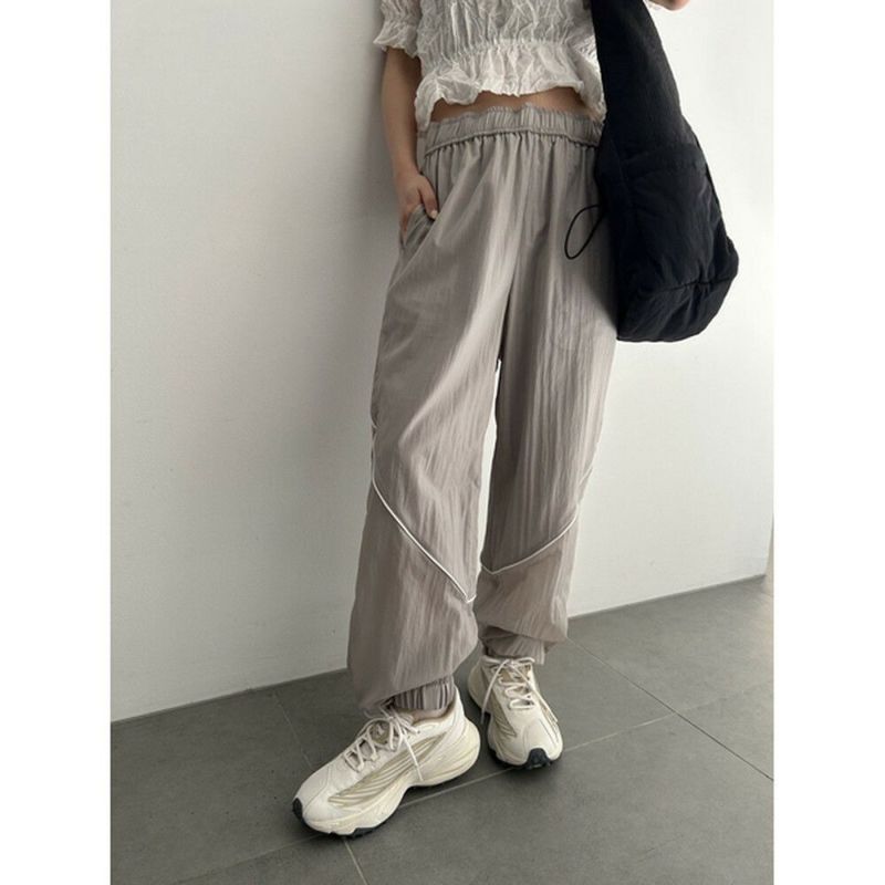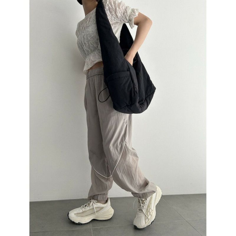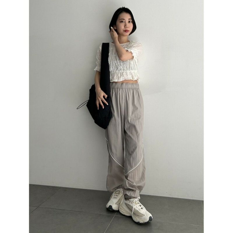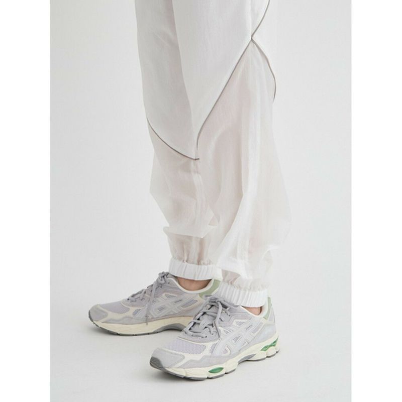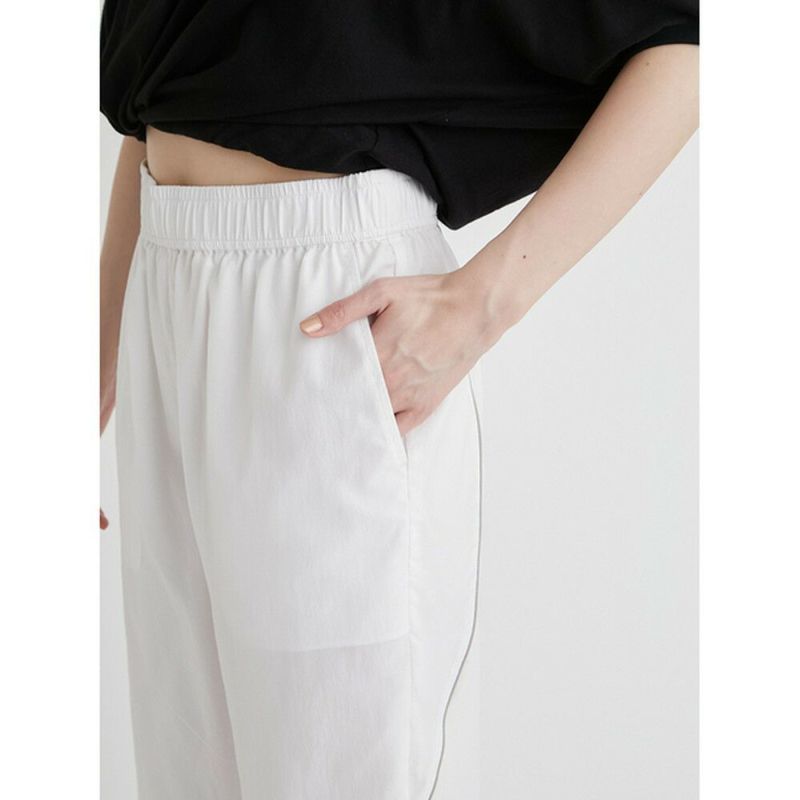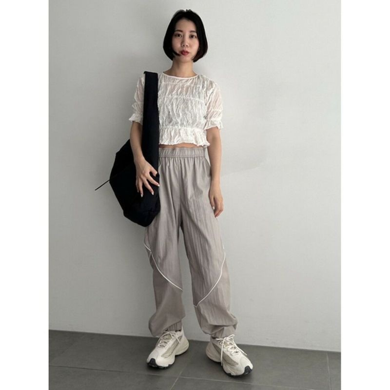 空気のように軽いウエストゴムのアクティブパンツ。有機的な曲線をパイピングで表現し、膝から下がシアーで透け感のある仕様になっています。