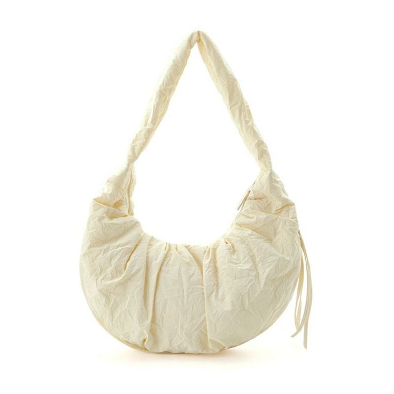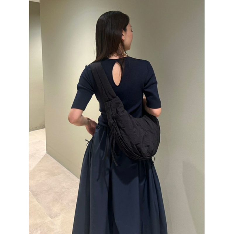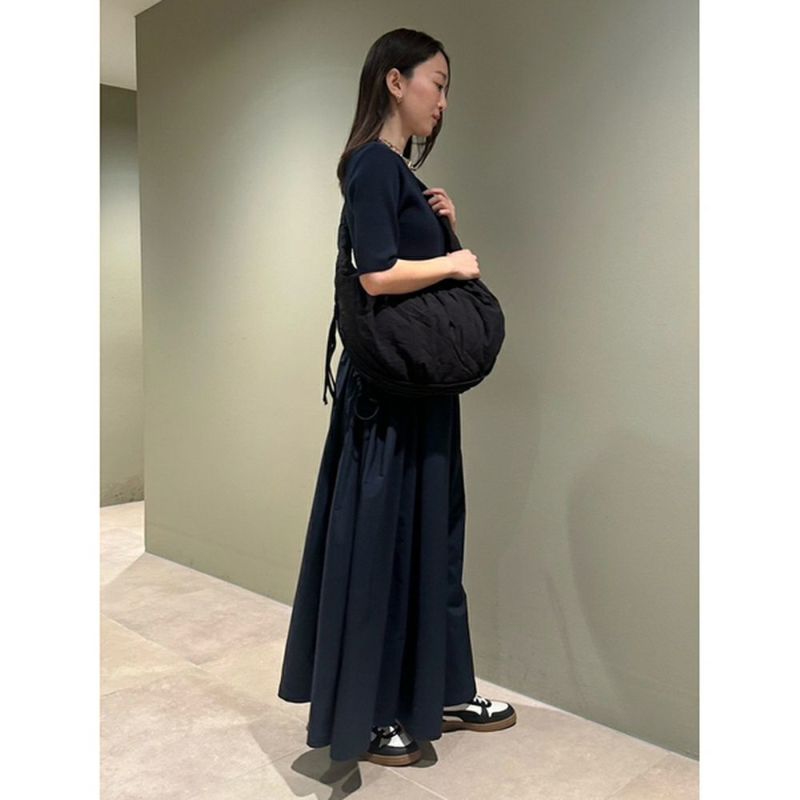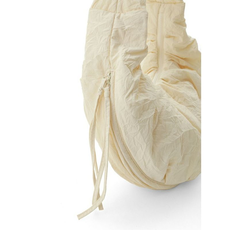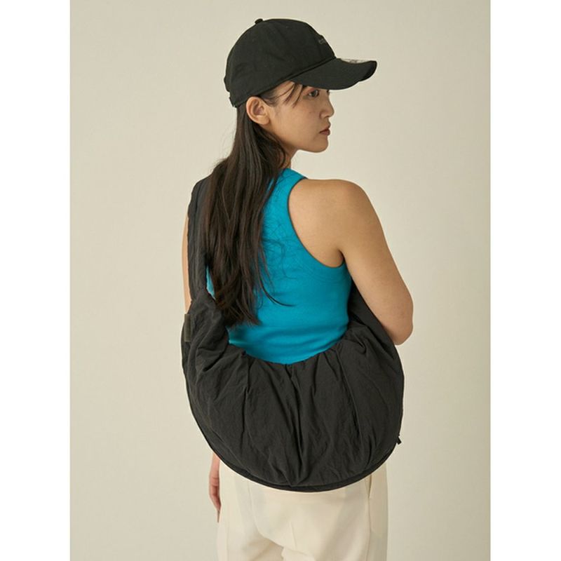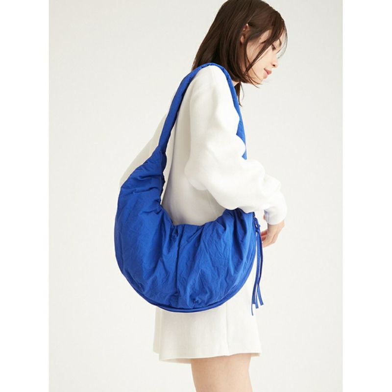 ナイロン素材にワッシャー加工を施した、emmiならではのスポーティーさを兼ね備えたショルダーバッグ。中綿入りなので柔らかく、コロンとした可愛らしいフォルムがポイント。マチ部分にファスナーがついているので、開くと容量が多い時はマチを広げて沢山入る仕様。斜め掛けはもちろん、肩掛けにもちょうど良い長さです。