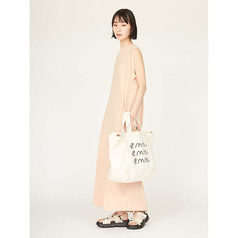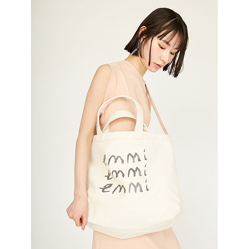 海へのレジャーなどemmiでも大切にしているアウトドアシーンや多目的にお使いいただける大容量のWEEKEND TOTE BAGはエコストア本国の社長パブロさんがコレクションをイメージして手書きした有機的なグラフィックロゴプリントがアスセントになっています。