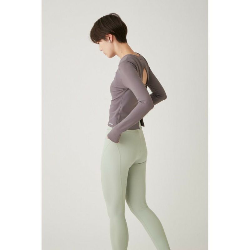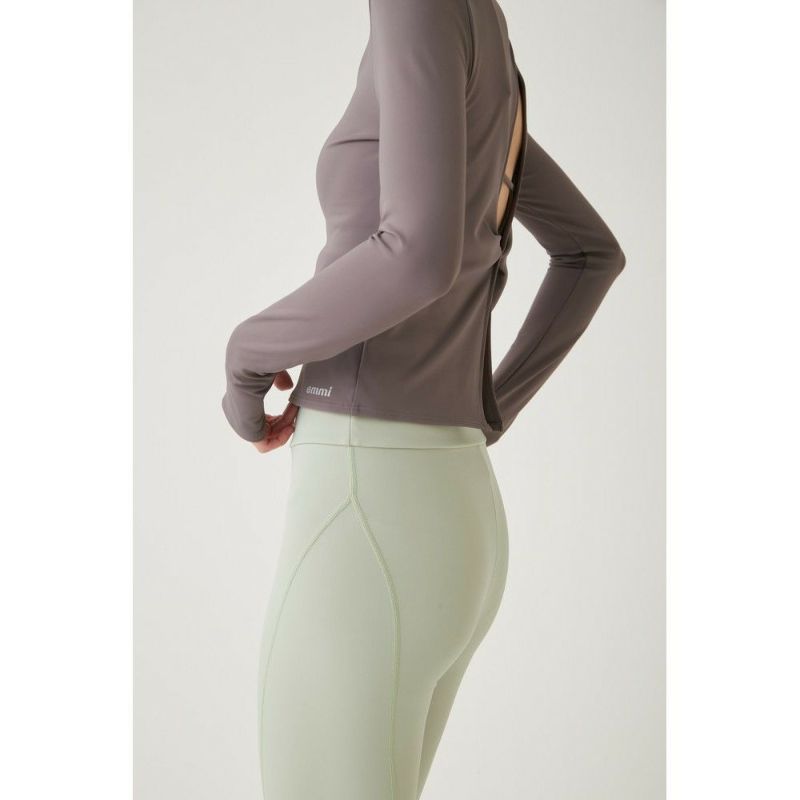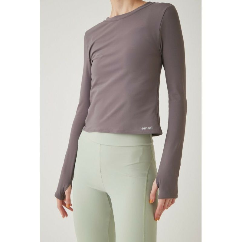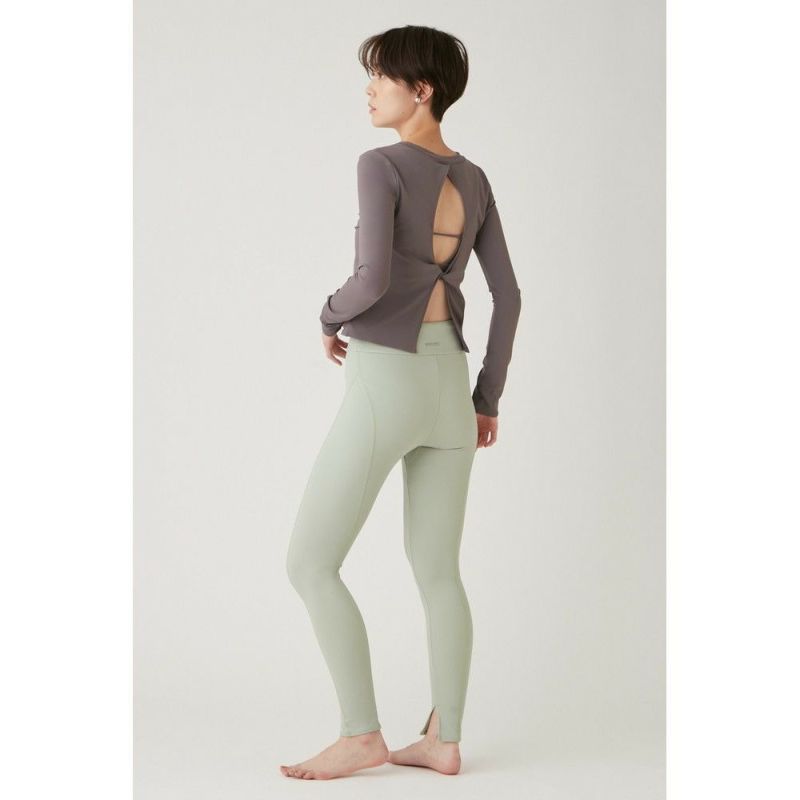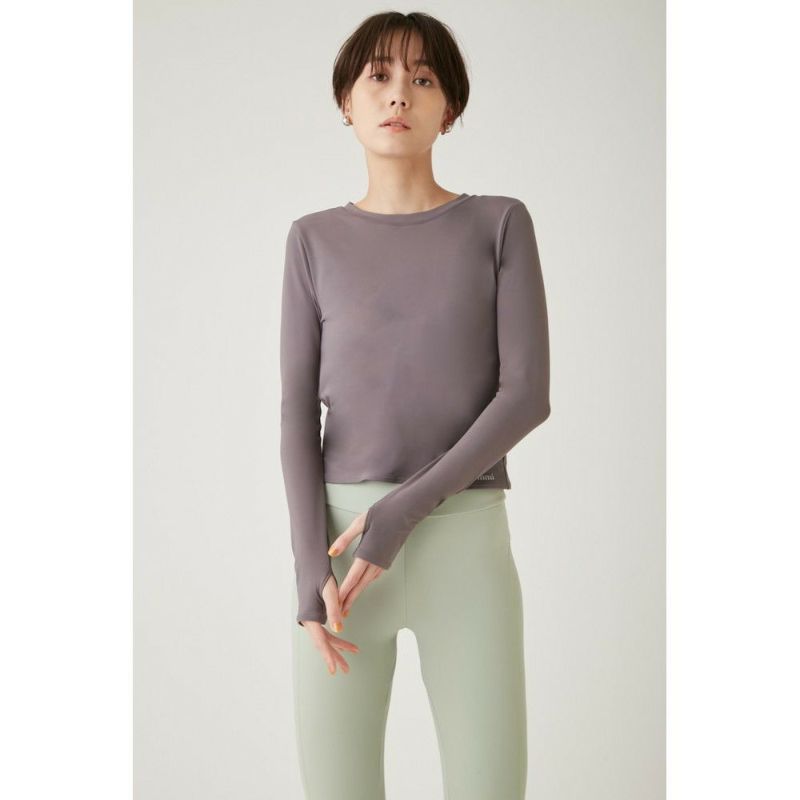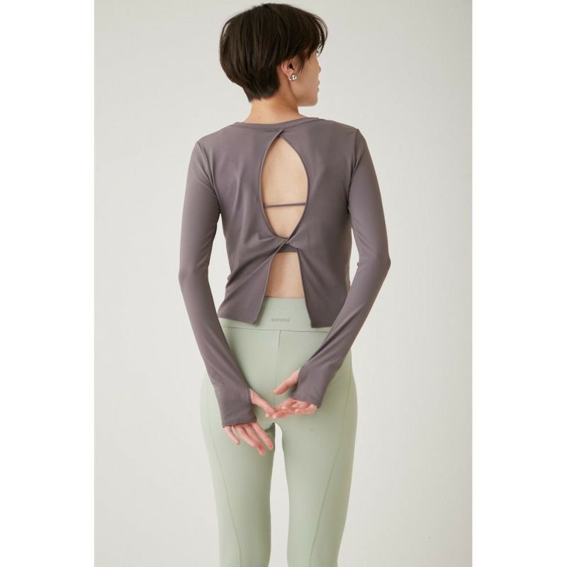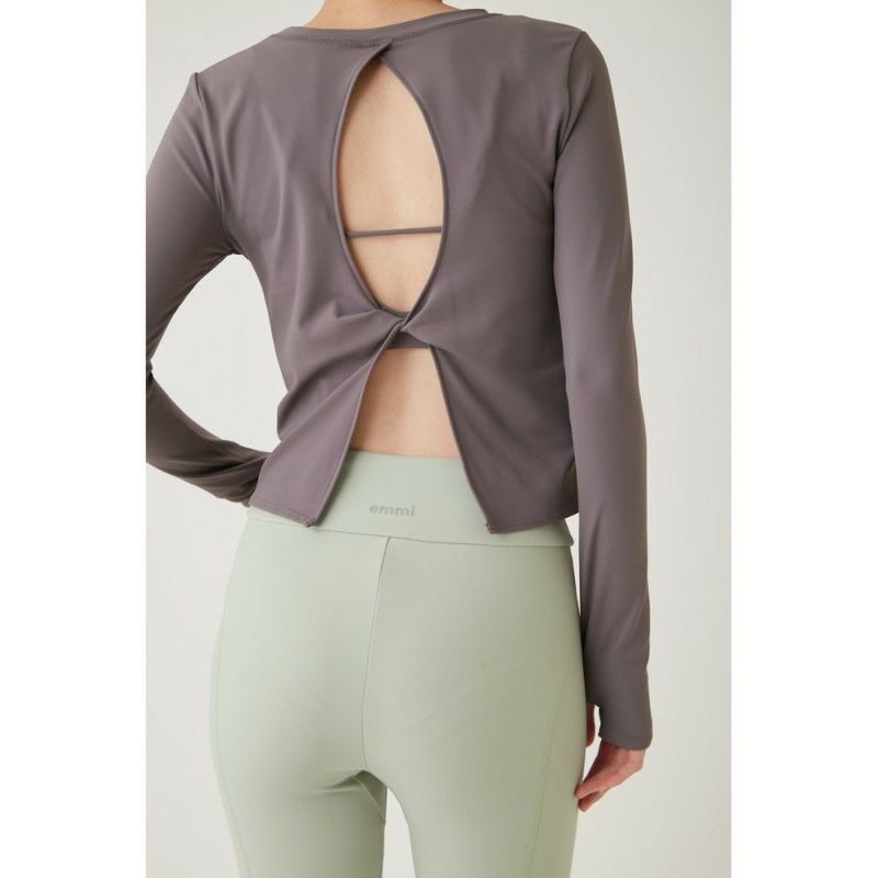 バックスタイルが大胆にあいているデザインで、さり気ないねじりディティールが可愛い長袖トップス。動きやすくするために体形にピッタリフィットした作りになっており、ブラトップの上に着てスポーツしやすいアイテムです。なめらかで伸びがよく、涼しく快適な着心地です。