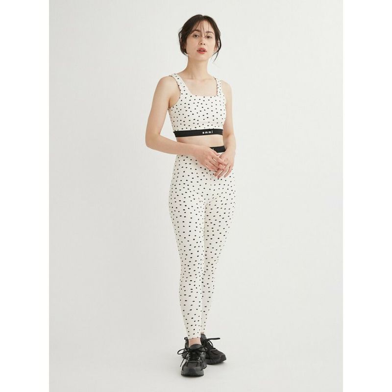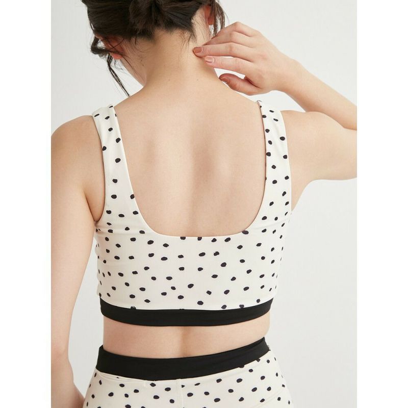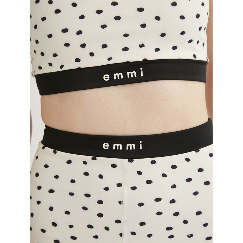 不規則なドット柄がレトロな印象のemmiオリジナル柄。今回はスクエアネックで首回りがすっきり見えるシルエットに。