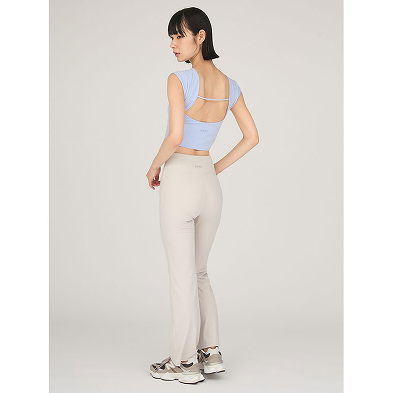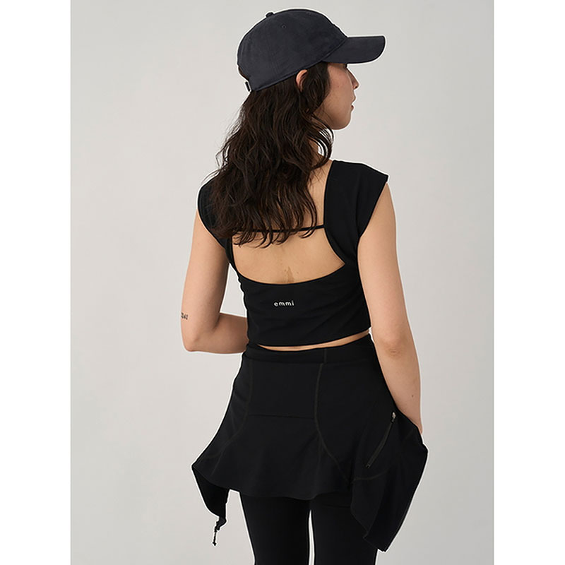 背中が大胆に開いたデザインが特徴的なカップ付きトップス。フレンチスリーブデザインで、着丈は程よく短めなので、普段使いにもぴったり。さらに、アクティブウェアとしても活躍する一枚です。快適なカップ付きで、動きやすさとスタイルを両立させたアイテムです。