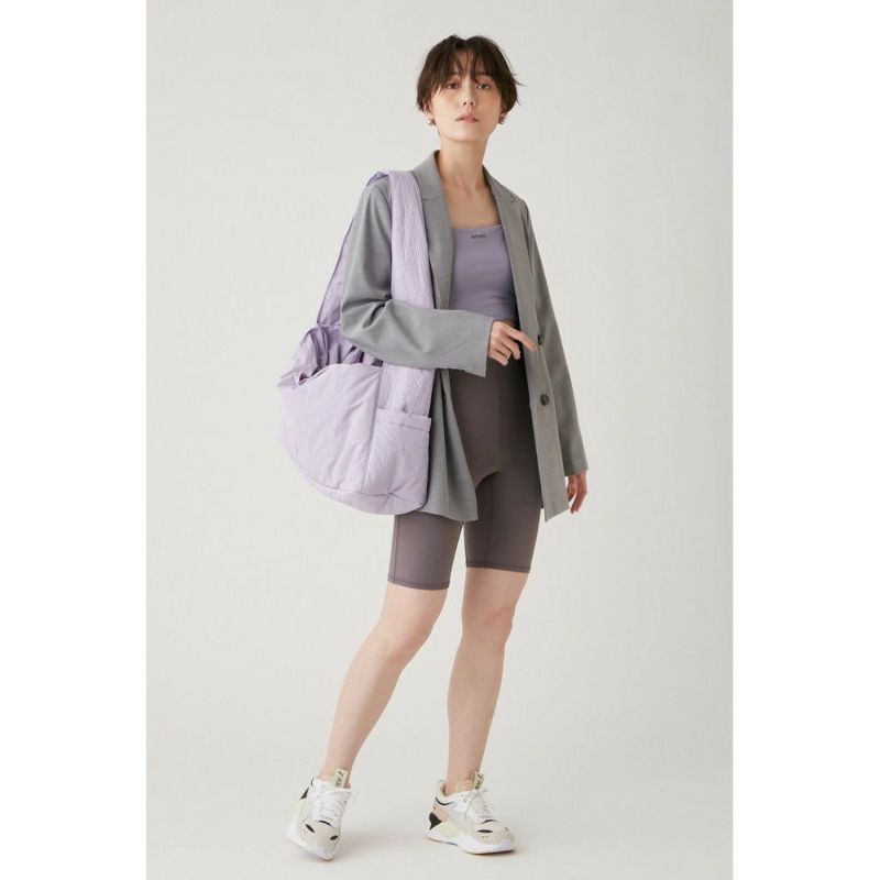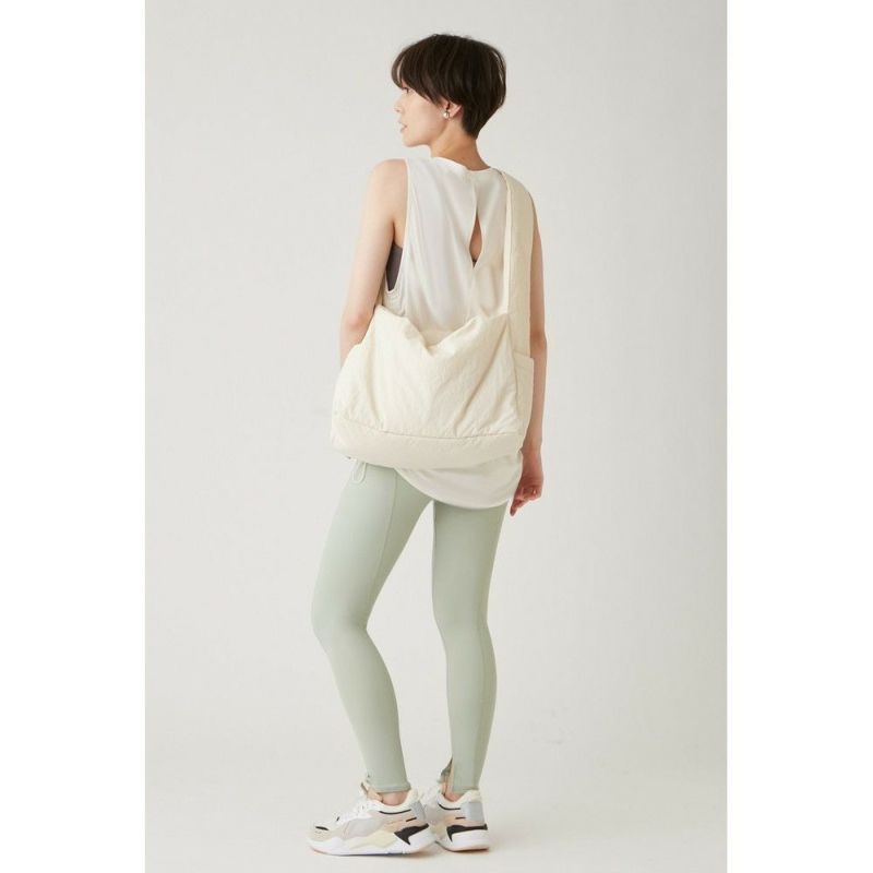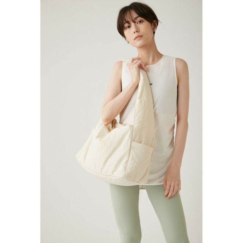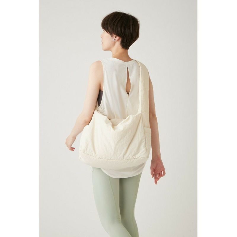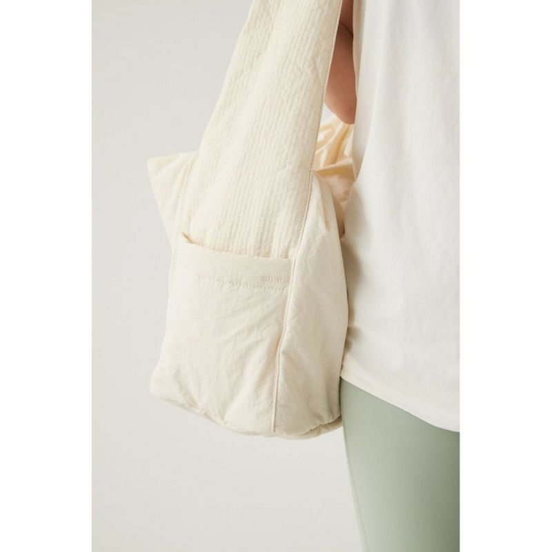 中綿を入れたボリューミーなシルエットとカジュアルになり過ぎないマット感のあるナイロン素材でYOGA以外でも普段のお洋服とのかけ合わせも新鮮なBAGです。カジュアルスタイルはもちろん、ジャケットスタイルやフェミニンなワンピースなどのスタイリングに斜め掛けで大人っぽく合わせるのもおススメ。内側のポケットの他に両サイドにはボトル入れにも携帯も入る外ポケットがついているので、すぐ必要な物を取り出せるのもポイント。(ポケットは外側に2個、内側に3個)巾着型になっておりドロストで閉じる仕様にしているのでたっぷりな容量が入ります。1泊の旅行などにも対応できます。