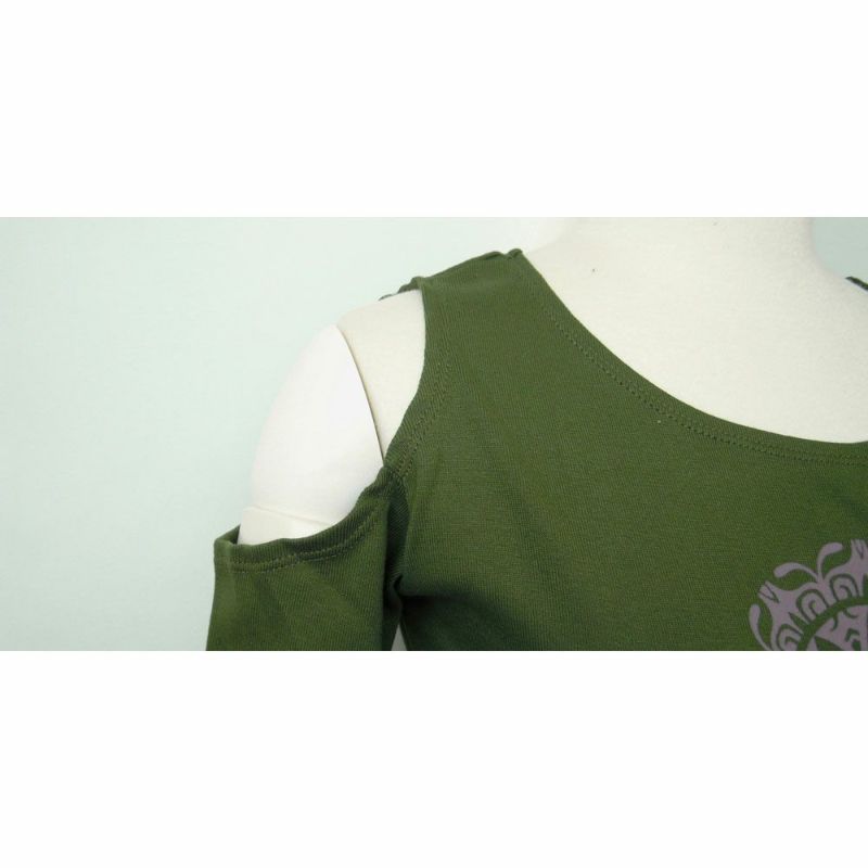 両肩がオープンとなっていて、袖先に向かって、ラッパのように広がるスリーブ袖になっています。