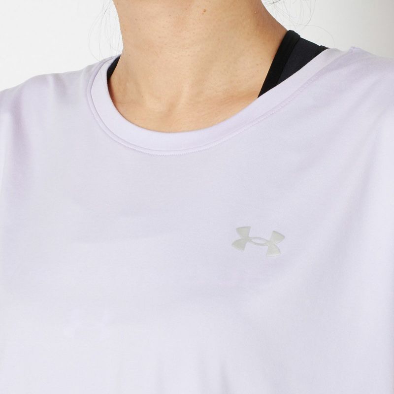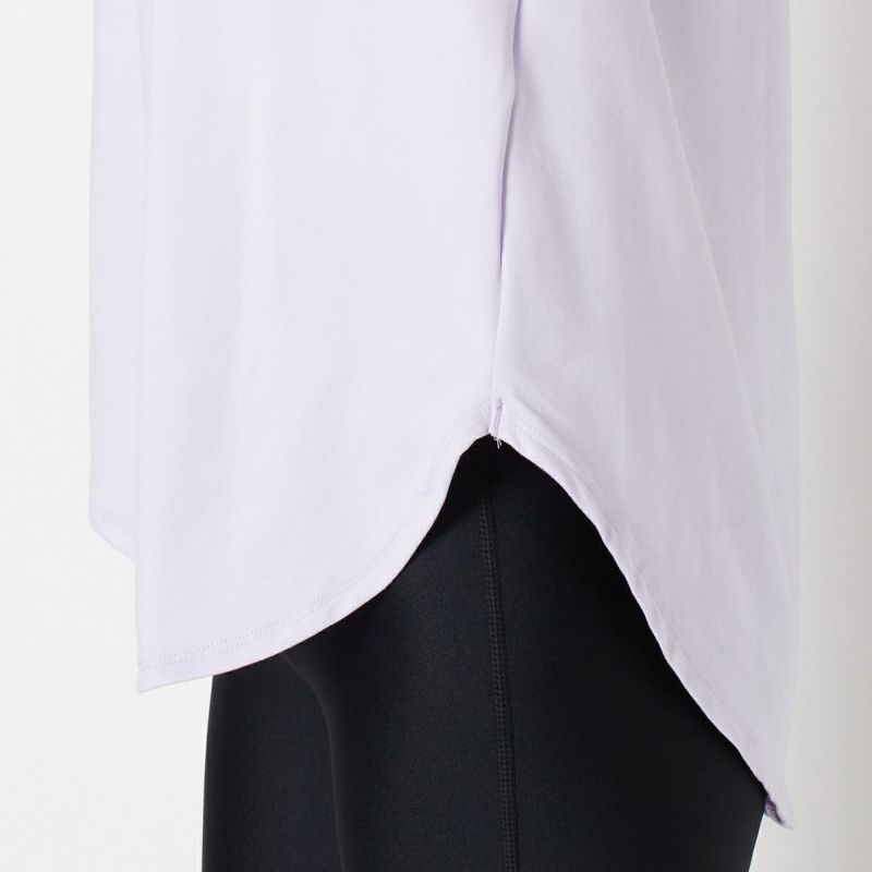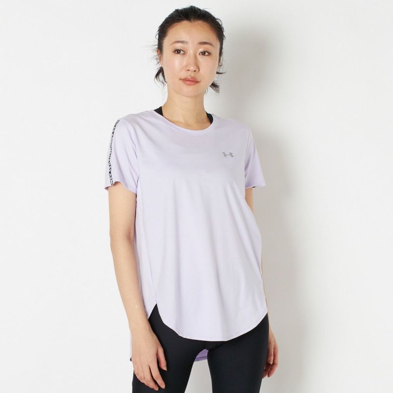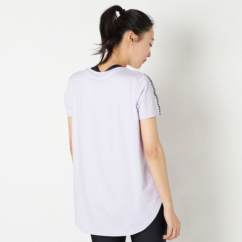 しなやかで光沢のあるストレッチカットソー生地で仕立てたTシャツ。袖のロゴテープをアクセントに効かせたシンプルなデザインで、合わせるボトムのデザインを選びません。ラウンドカットの裾が、目くらまし効果を発揮しながら柔らかなフェミニンさをプラス。やや薄手で軽く、全方向に伸縮するので、Tシャツを着たままでも運動を楽しめます。
