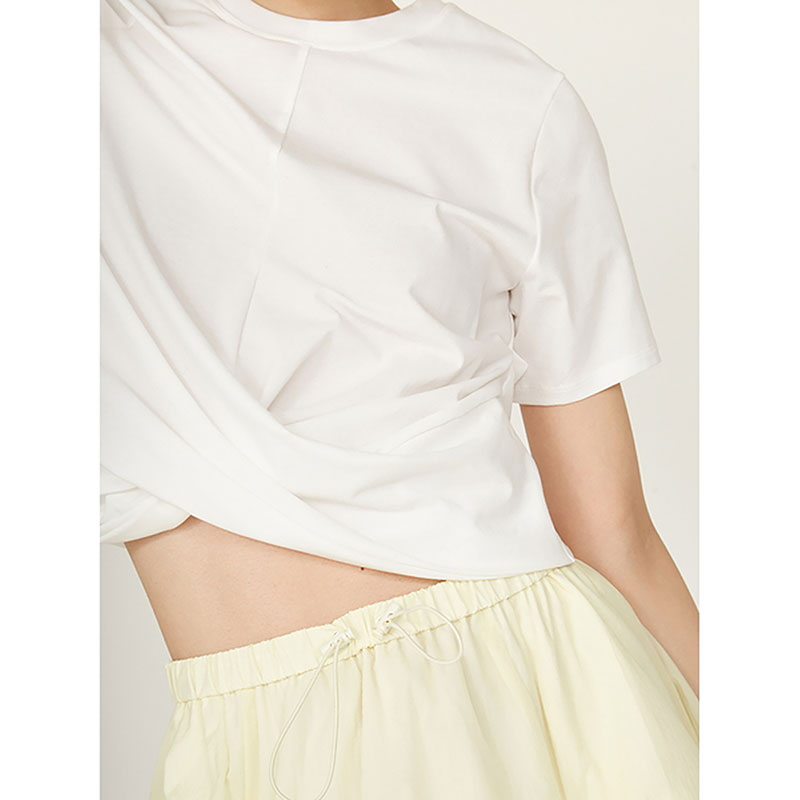 クロップド丈でハイウエストのボトムとも相性が良く、どんなボトムスと合わせてもバランスのとりやすいトップスです。