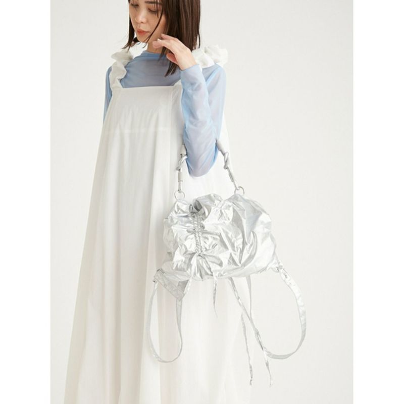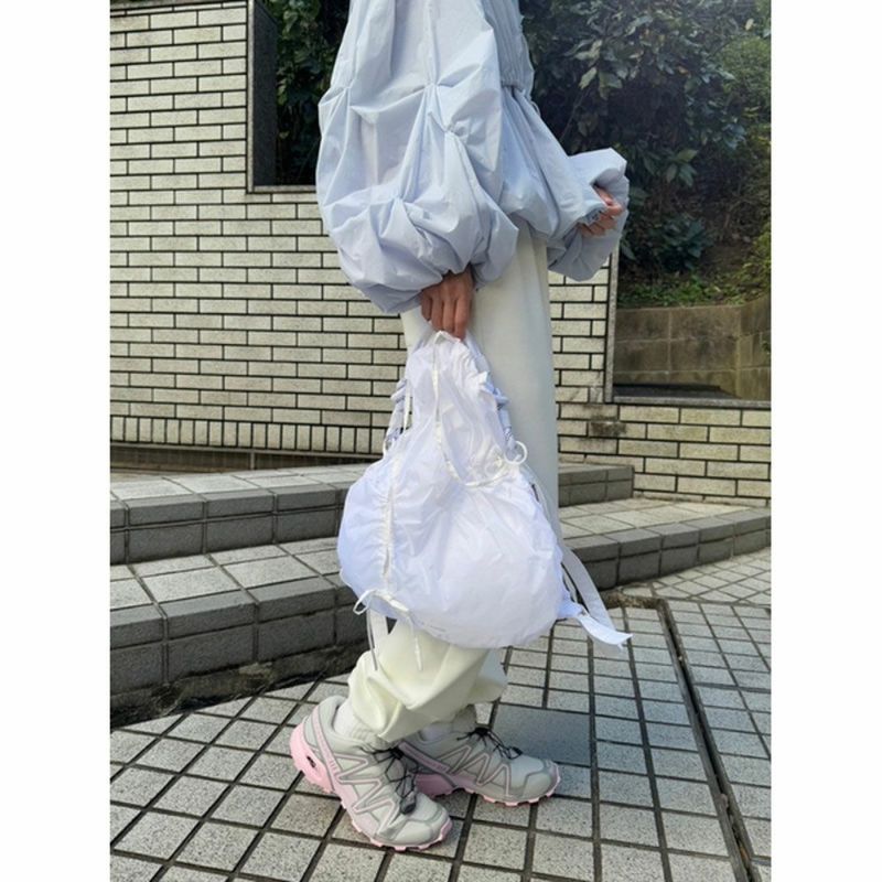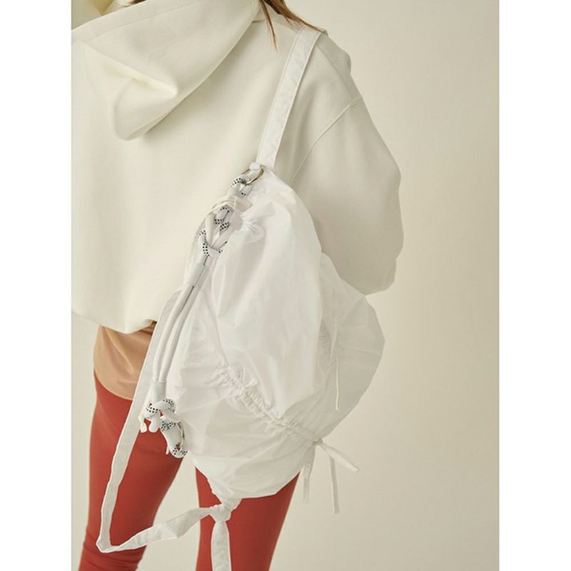 トートバッグとしても持てる2way仕様のナップザック。付属のクライミングロープの場所を付け替えるとトートバッグとしても使えます。ドロストで絞り具合を変えることもでき、スタイルに合わせてアレンジ可能。スポーティーな素材感ながら、女性らしいデザインで挑戦しやすいトレンドアイテムです。