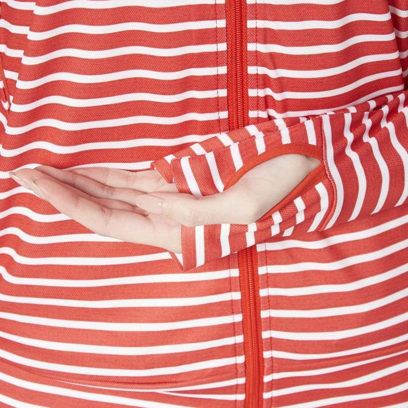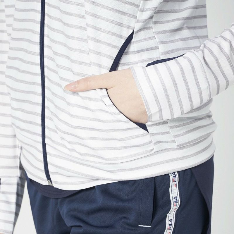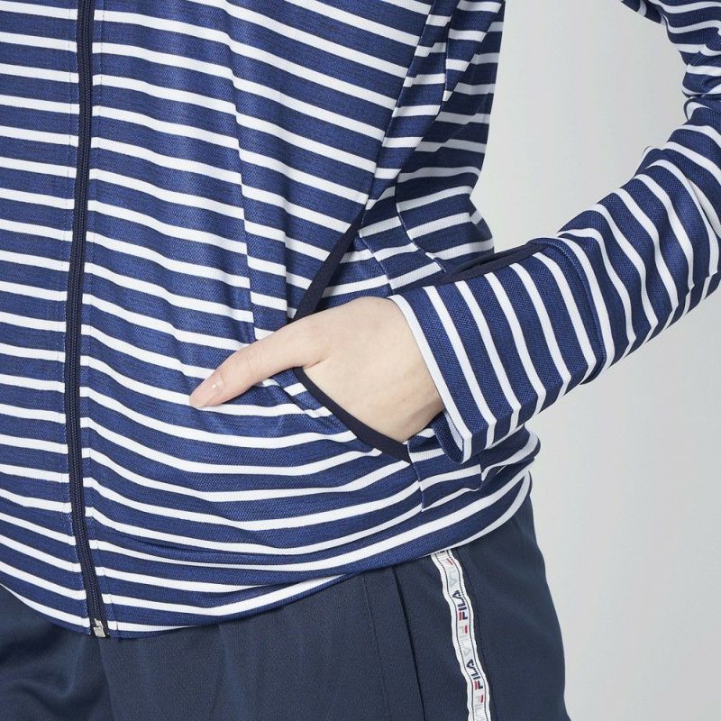 パーカー襟ぐりはスピンドルで調節可能。指穴仕様。ポケットは、カラーパイピングがアクセントになっています。