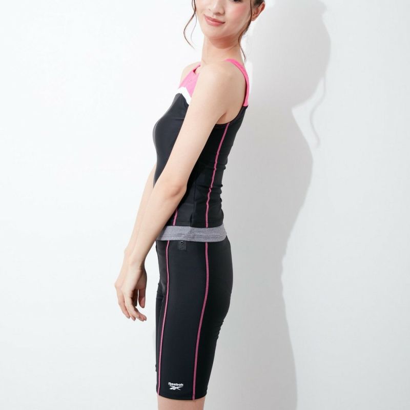 シンプルなデザインのReebok セパレーツ無地水着。裾めくれ防止機能付き。股下24cm(9M).15mmアンダーゴム、カップは縫い込みカップ式。胸を固定して綺麗に見せます。胸元の横切替でバストアップ効果。縦ラインステッチで全身ほっそりスッキリ。