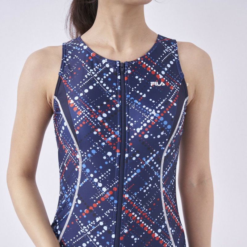 ファスナー付で着脱が楽なセパレーツ水着。マルチカラーのドット柄プリントです。カップの取替えができる挿入カップ式。アンダー内側の15mmゴムが胸を固定し綺麗に見せます。切替えの視覚効果でシャープな脇ライン。ボトム前部分は伸びの良い裏地付。ウエストはスピンドルで調節可能。FILAのロゴ入り。クイックジップ機能付きなので楽にファスナーが上がります。めくれ防止機能付。