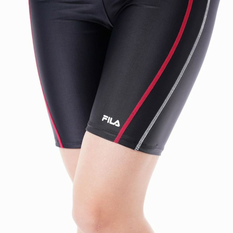 ファスナー付で着脱が楽なセパレーツ水着。股下19cmのボトムセット。お好きなカップに取替えできる挿入カップ式。15mmのゴムがアンダー内側に入っていて胸を固定してきれいにみせてくれます。袖付きなので二の腕もカバー。襟元がスッキリ見えるパターンです。体に沿った切り替えと2本ステッチの視覚効果で脇ラインがシャープに見えます。ボトムの前部分はすべて伸びの良い裏地付。ウエストはスピンドル入りで調節できます。めくれ防止機能付。 FILAのロゴプリント入り。
