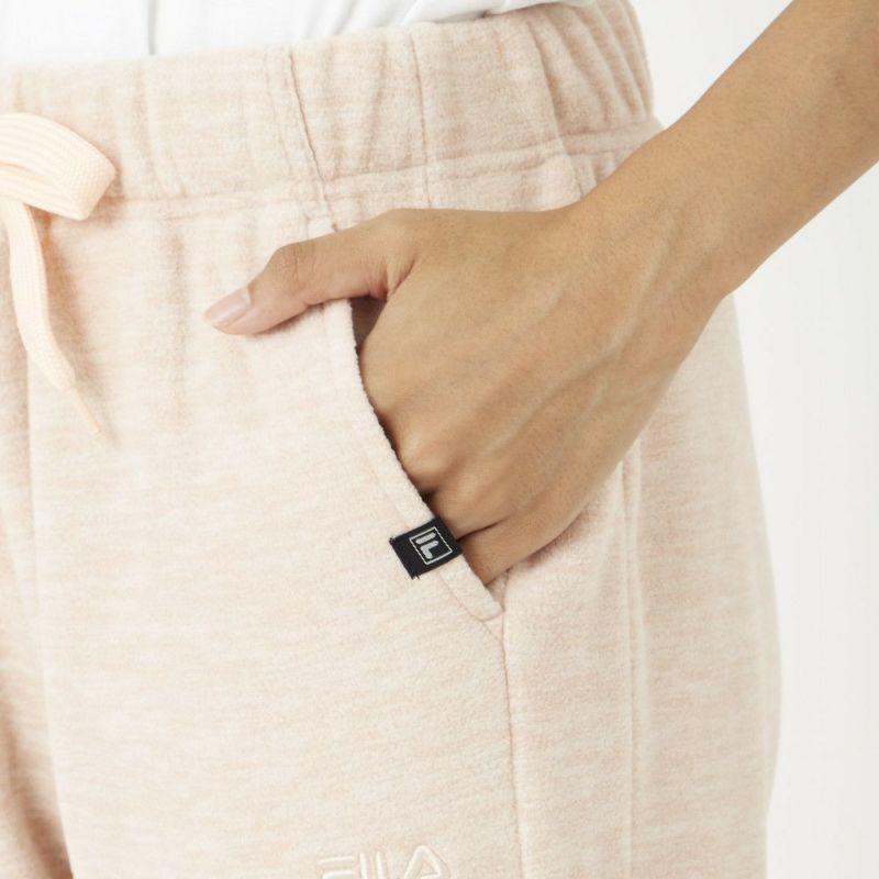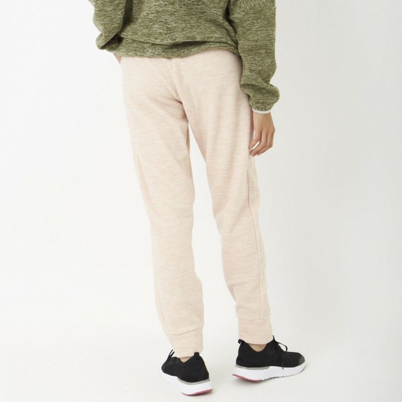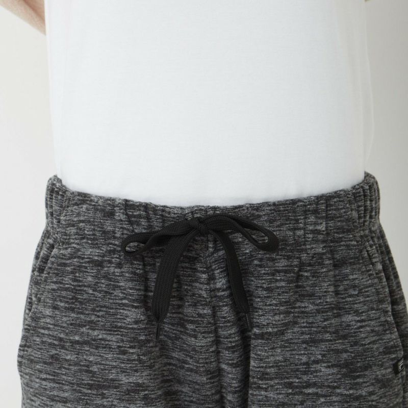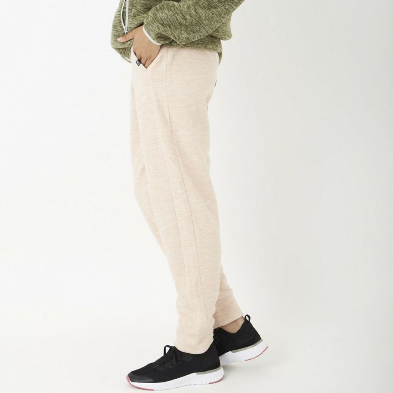 軽くて暖かい杢フリース。膝から下がタイトなシルエットのジョガーパンツ。裾リブ部分は内側がスリット仕様で足長効果あり。ウエストは紐調節できます。両脇ポケット付き。左ポケット部分にFILA のロゴ刺繍いり。