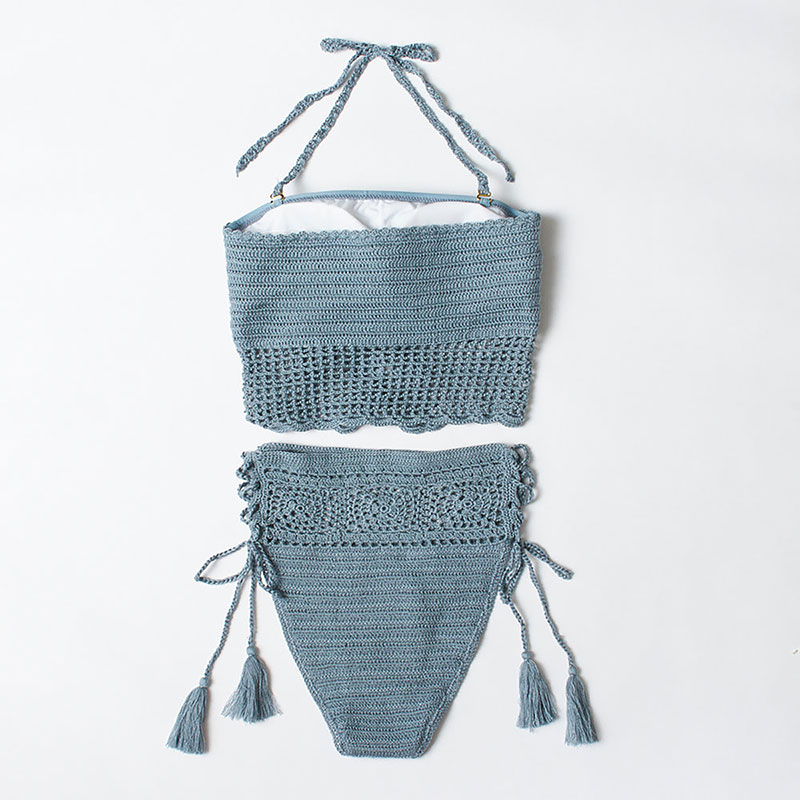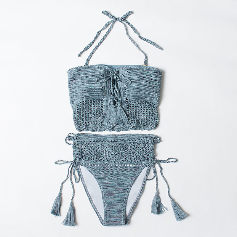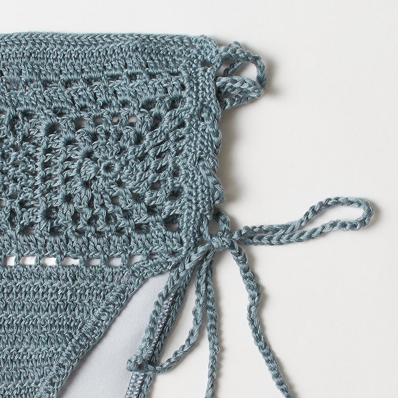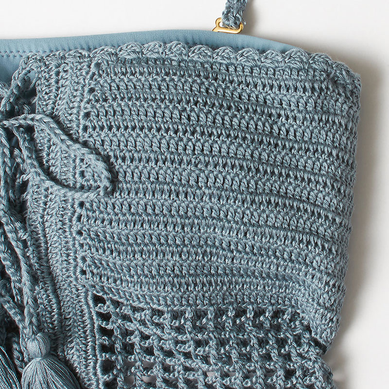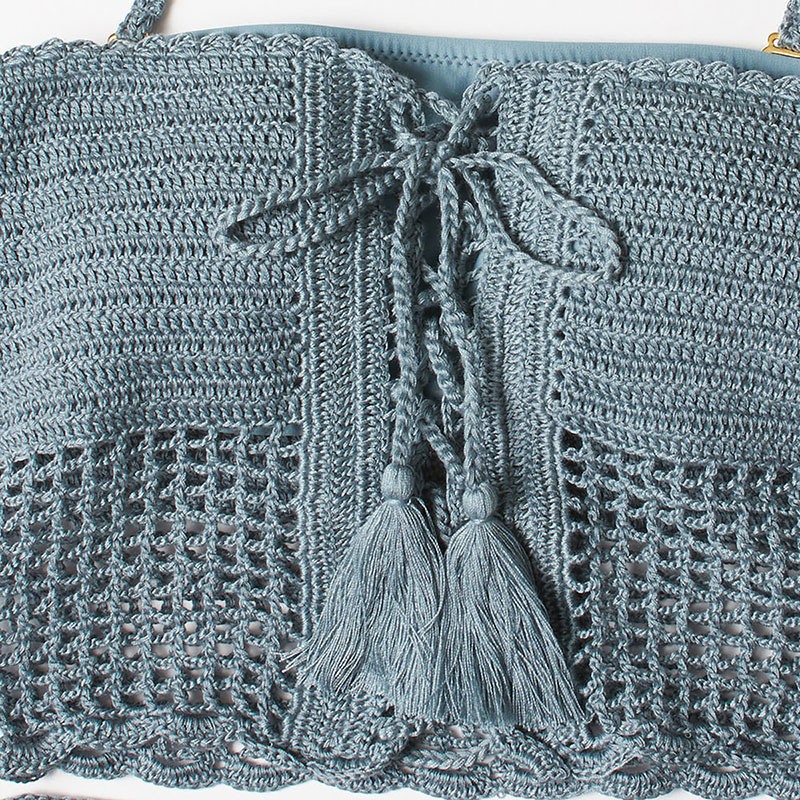 トレンドのクロシェニットを使用した今シーズンイチオシ水着! ミディ丈のトップで、ウエストを強調してくれるので美スタイルが叶うアイテムです。 フロントとボトムのサイドはレースアップでちょっぴり大人で上品な雰囲気に見せてくれます。 カラーも柔らかい印象のくすみブルーとベージュの2色展開で、ホテルプールや海外リゾートなど背伸びした大人な女性を演出してくれる1着です。ストラップは取り外し可能なのでバンドゥとしてもご着用頂けます。おしゃれでかわいい今季一押しアイテムです!