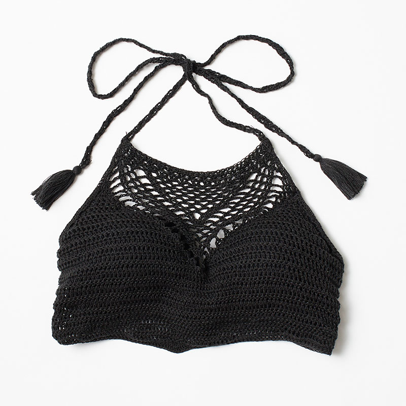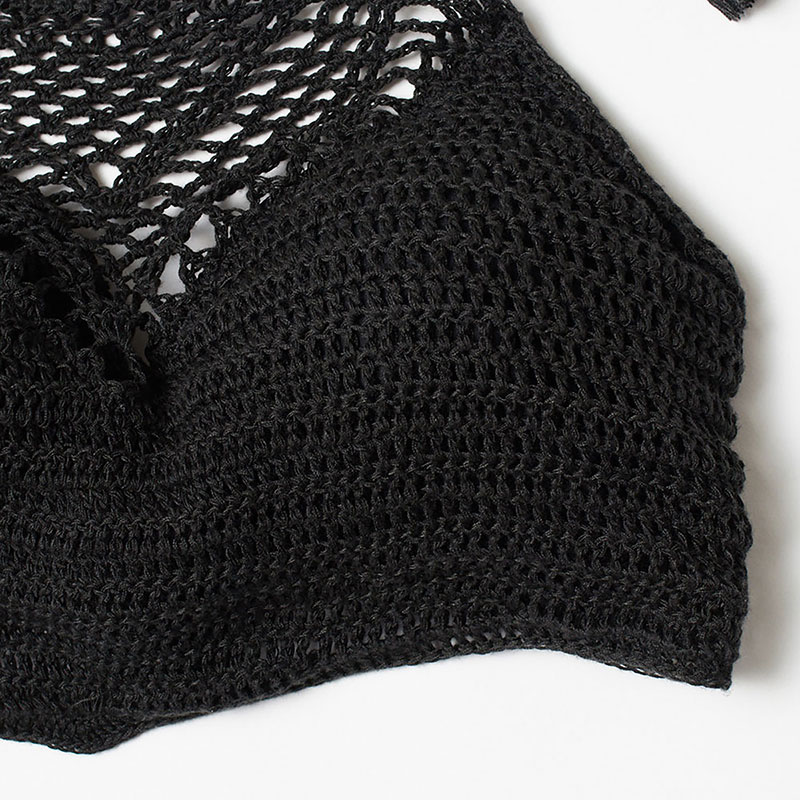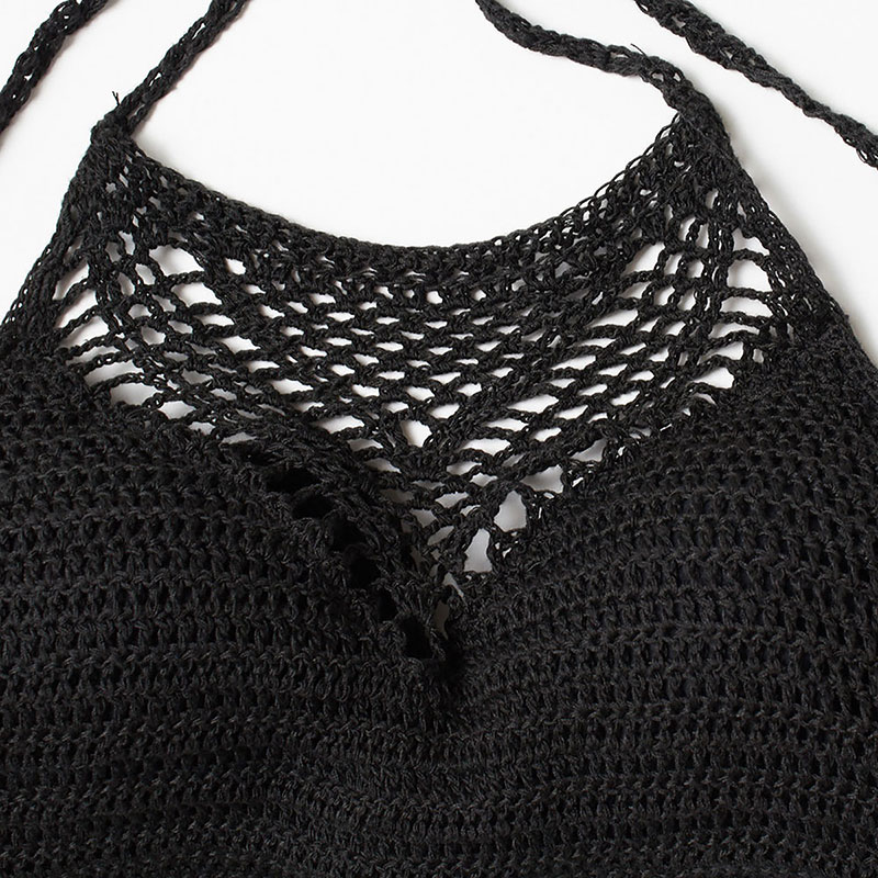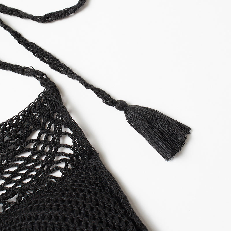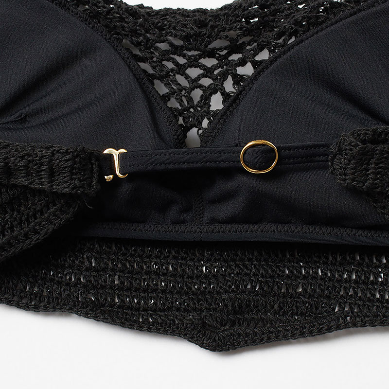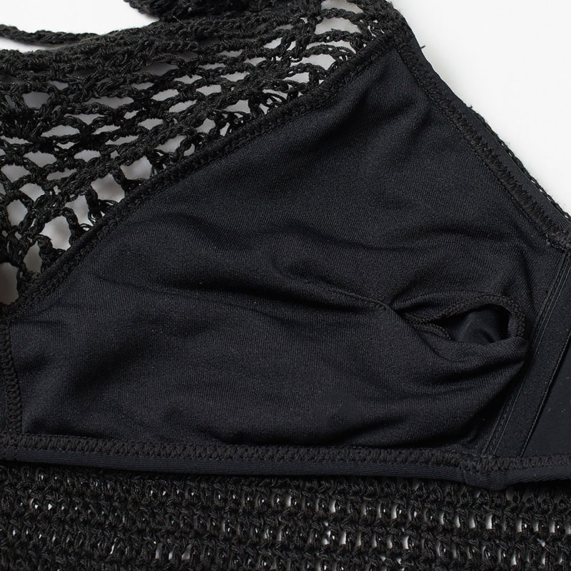 かぎ針編みのデコルテ部分の透け感が視線を誘うトップスとトロピカル柄プリントのショーツのセットアイテム。ネックストラップのタッセルがバックスタイルのアクセントに効いています。ナチュラル感のある大人っぽいカラーもポイントです。お手持ちの他の水着と合わせてのスタイリングも可能です。