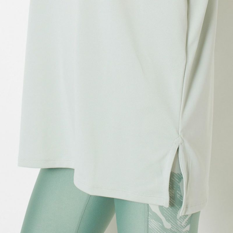 とろみのあるストレッチポリエステル生地で仕立てたオーバーサイズのクルーネックTシャツ。着回し力の高いシンプルなデザインで、合わせるボトムを選ばないコーディネートの強い味方。タイトなレギンスと合わせてもヒップまでカバーしてくれる長めの着丈も嬉しいポイント。サイドスリット入りなのでタックインももたつかず綺麗に決まります。