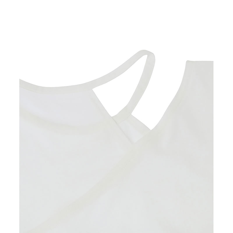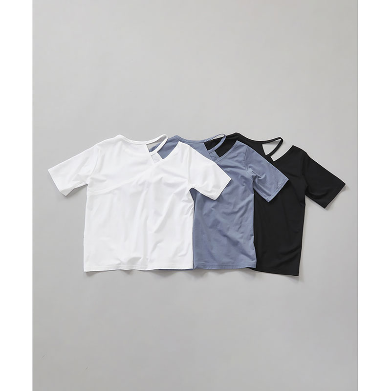 一枚でおしゃれ上級者見えするアシンメトリーな半袖トップス。片側だけカットを施したデザインで、 さりげない肌見せが大人の抜け感を演出。前後で異なる開き具合もこだわりポイントで、後ろはやや広めに開いていています。細ストラップのインナーを覗かせるのがおすすめ。ストレッチ・速乾・UV カットなど、暑い季節に嬉しい高機能素材を使用し、着心地も快適。長すぎず短すぎない絶妙な丈感で、どんなボトムスとも好相性です。