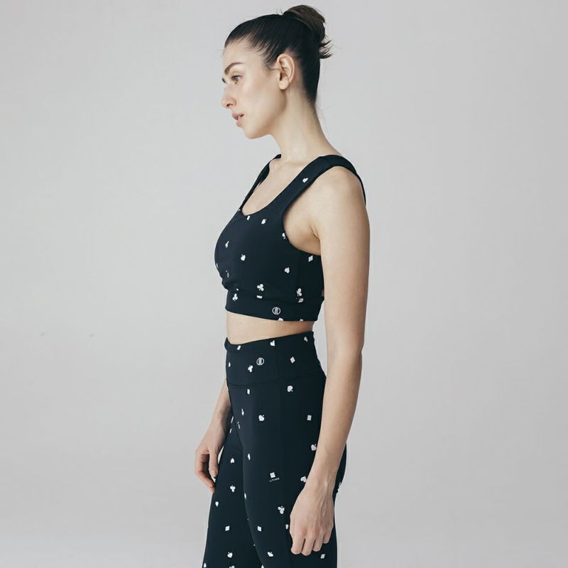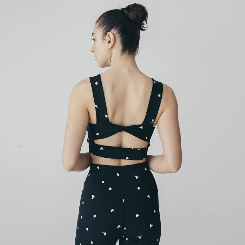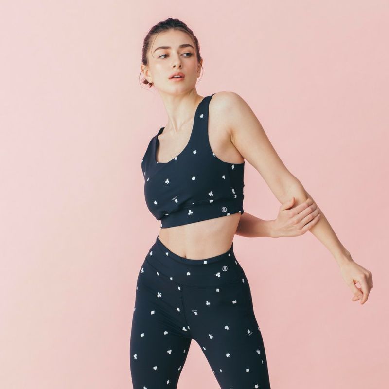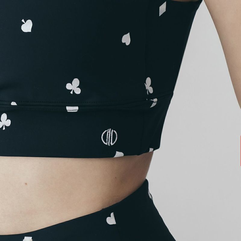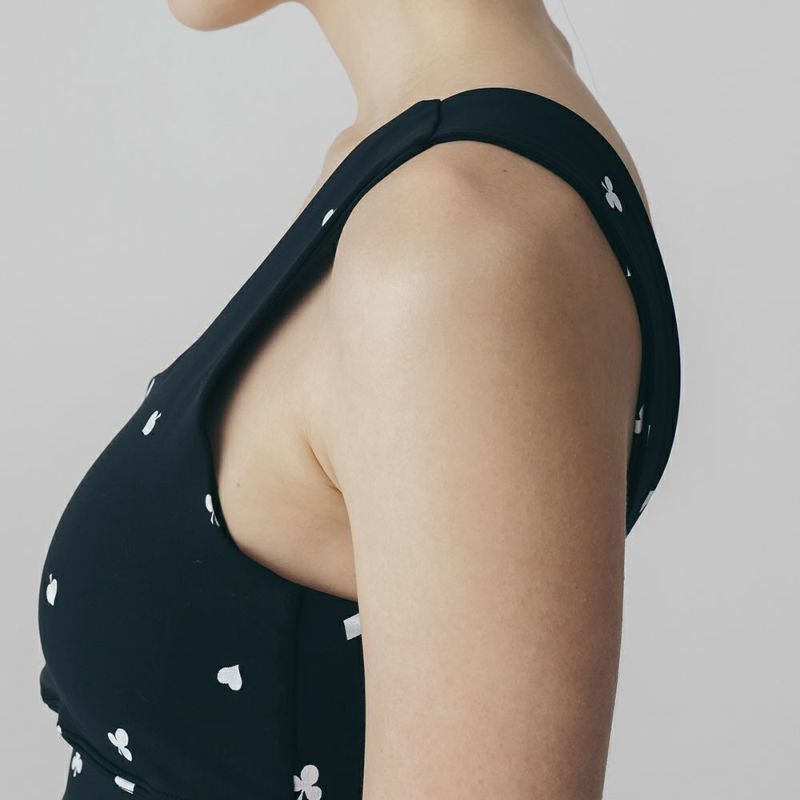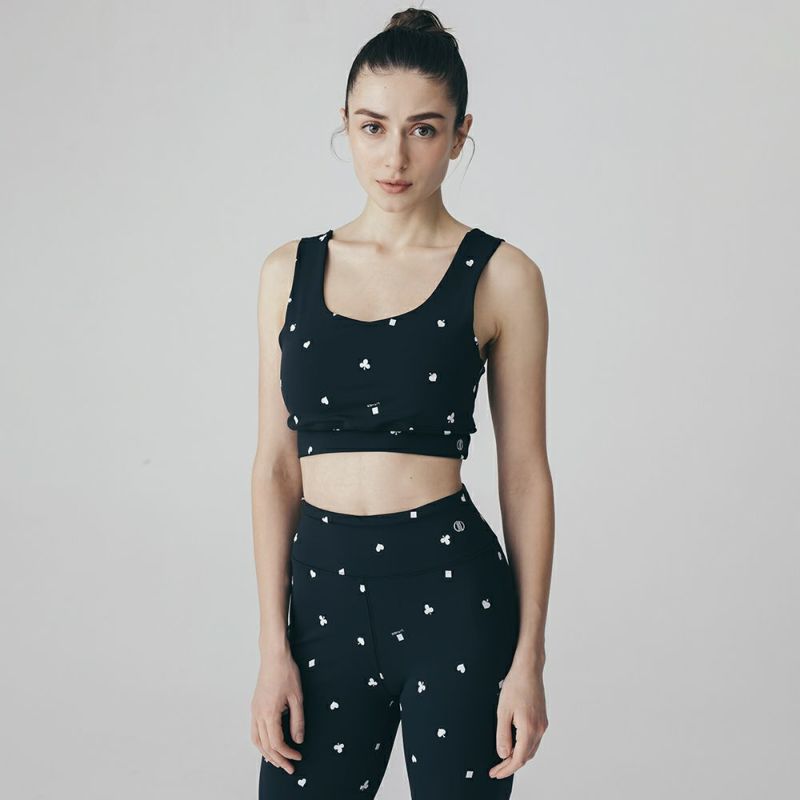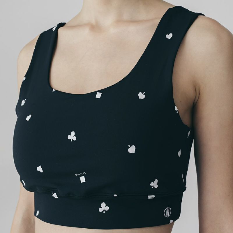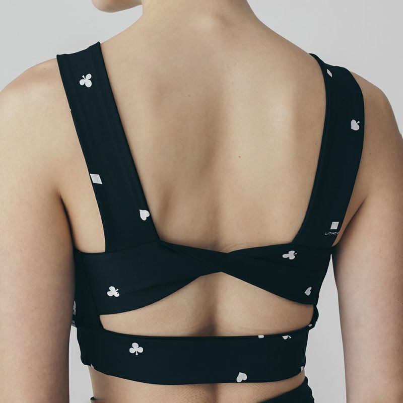 リジーオリジナルのプリントブラトップ。個性的なトランプ柄はブラック調で大人でも着やすいデザインです。バックのねじりディテールもアクセント。伸びのよいストレッチ素材でなめらかな着心地です。同柄のレギンスとセットアップの着こなしが可能です。デザインは人気ファッションブランドDOUBLE STANDARD CLOTHINGが監修しています。