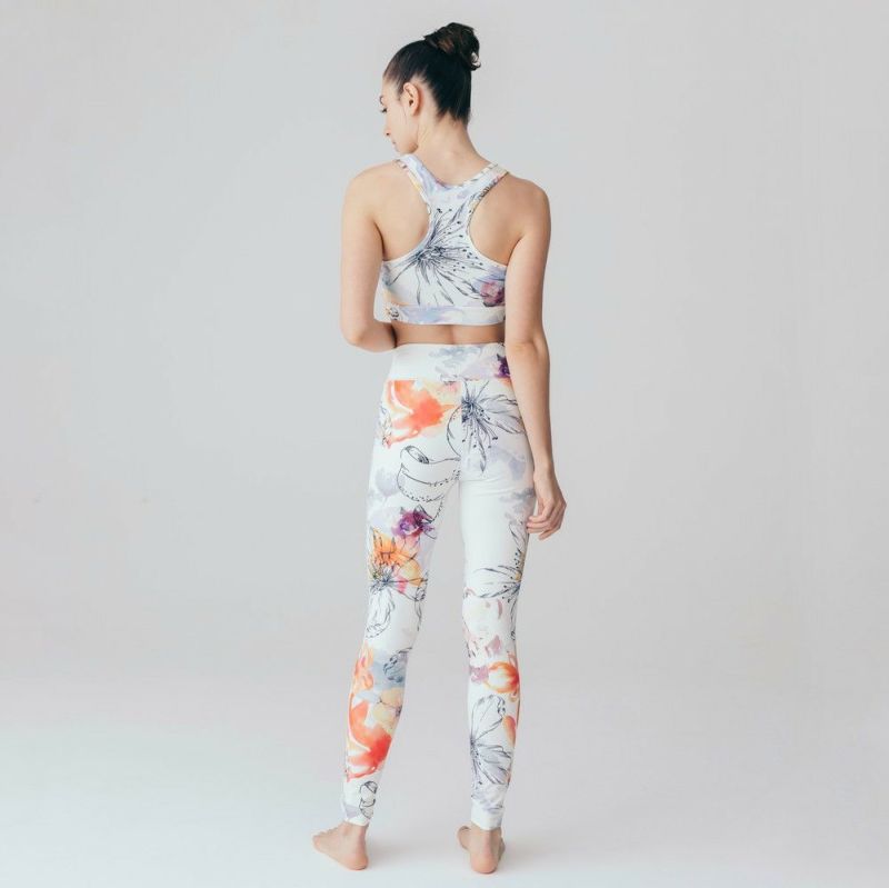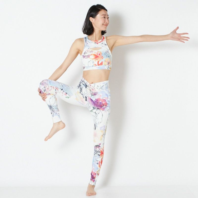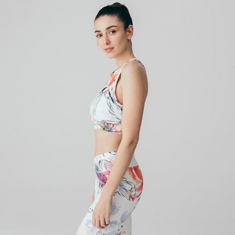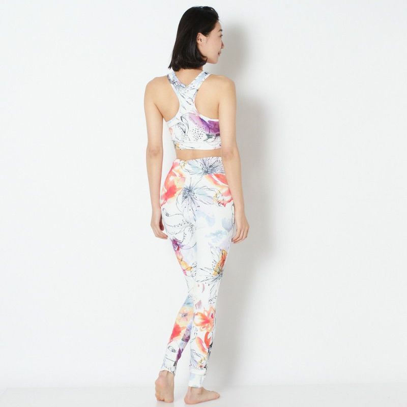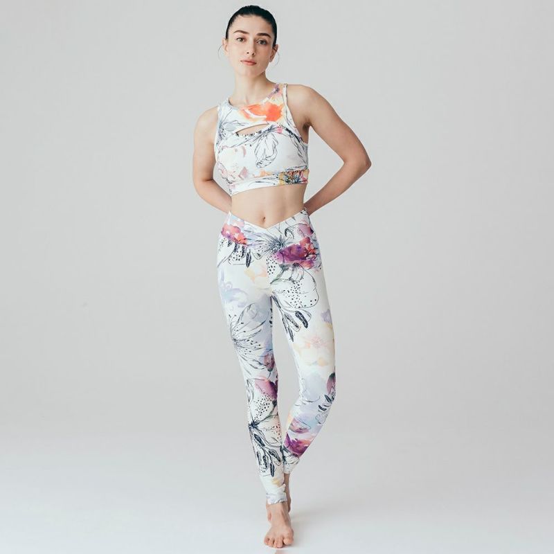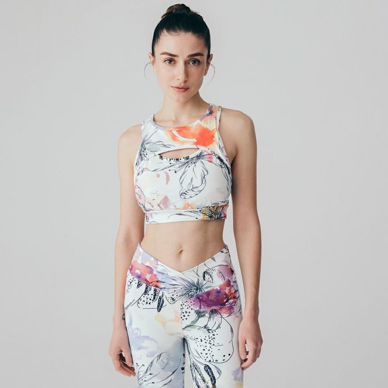 リジーオリジナルのプリントブラトップ。華やかな印象のフラワー柄です。胸元あきデザインでファッション性の高い1枚。伸びのよいストレッチ素材でなめらかな着心地です。同柄のレギンスとセットアップの着こなしが可能です。