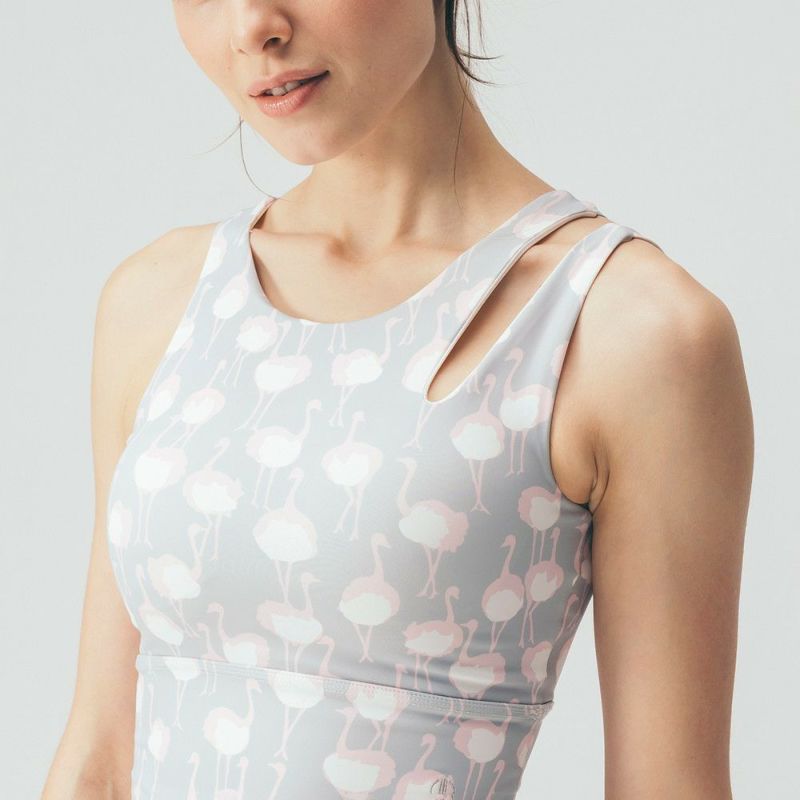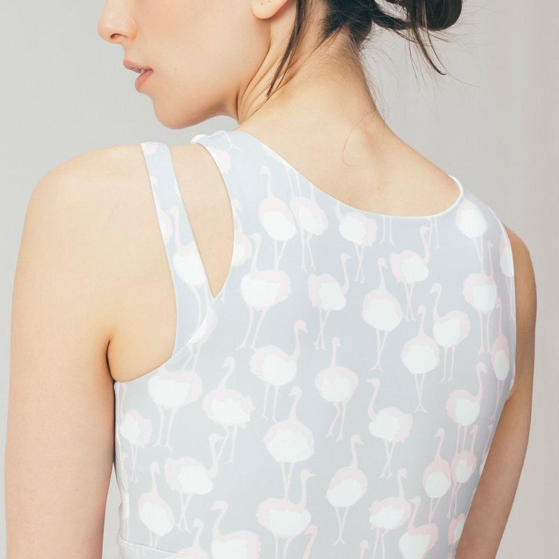 アシンメトリーな左肩のあきがポイントのフラミンゴ柄プリントブラトップ。しっかりとお腹までカバーしてくれる嬉しい長め丈です。首元が高めで露出も少なく安定感のある着心地です。淡いカラーのグレーはどの色のウェアとも合わせやすいニュアンストーン。デザインはDOUBLE STANDARD CLOTHINGが監修しています。