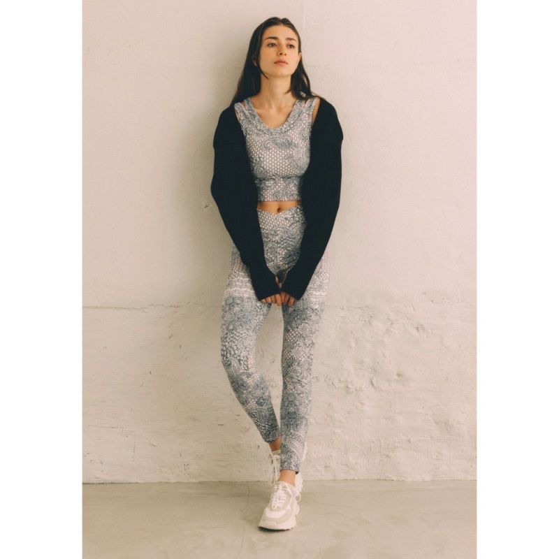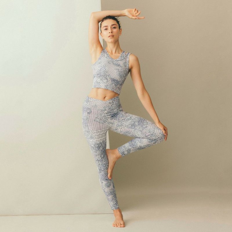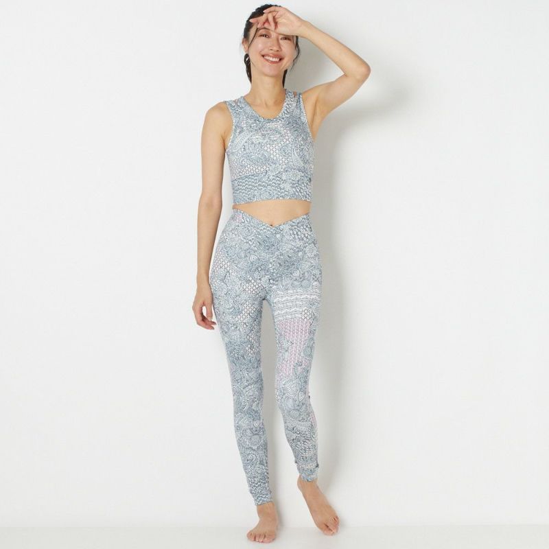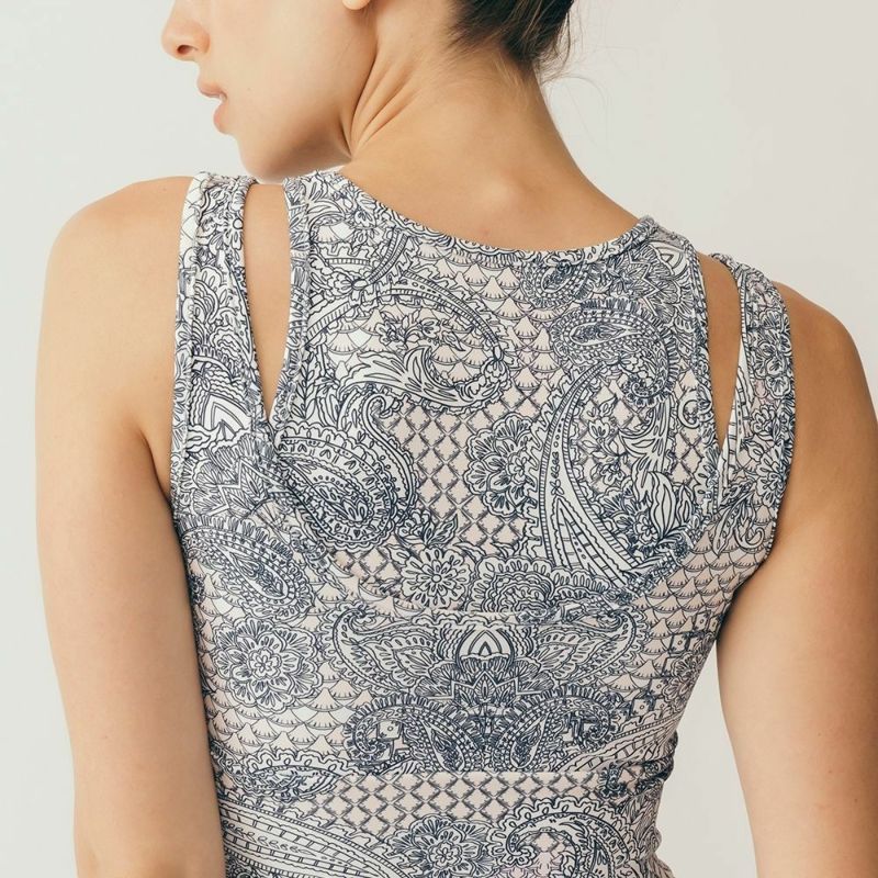 リジーオリジナルのプリントブラトップ。少し長めの丈感で露出を控えつつお腹周りをカバーしてくれます。首元もしっかりとカバーし安心感のある着心地。柔らかく伸びのよいストレッチ素材でなめらかな着心地です。淡いピンクとベージュの色合いが優しい、ニュアンストーンのアラベスク柄プリント。